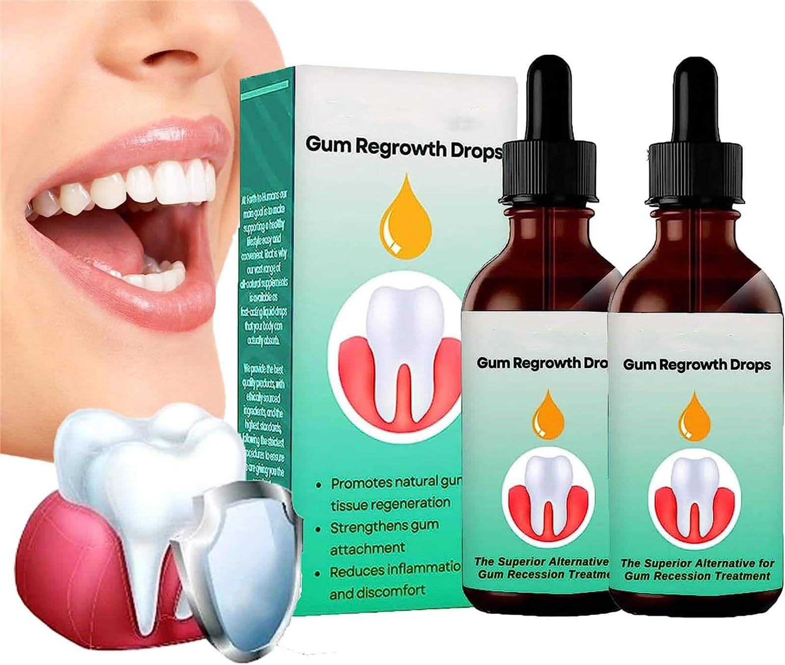 Feature:1. Promotes the regeneration of natural gum tissue2. Improve gingival adhesion3. Reduce discomfort4. Improves overall gum health. Specification:Name: Gum Regeneration DropsNet Weight: 30mlShelf Life: 3 years Package Includes:1 2 3 pcs x Gum Regeneration Drops How to Use:1. Simply mix a few drops with water and swish in your mouth for about 1 minute. Spit out the solution after 1 minute without gargling again.2. If your problem is severe, gently massage the drops into the area that needs it for a few minutes, making sure to cover the gums.Easy to Use Easy to use before going to bed, a few drops mixed with water and rinsed for one minute, providing users with a gentle yet powerful way to rejuvenate gums. Fresh Breath Gum regeneration drops relieve tooth sensitivity, repair damage and receding gums. Menthol can freshen your breath. Gum Restoration Unlike invasive procedures or bulky equipment, gum regeneration drops provide a non-surgical and easy-to-use solution. Gum Regeneration Drops Gum disease can lead to a variety of problems, including receding gums or receding gums. Gum Regeneration Treatment Gum regeneration drops help reduce gum inflammation, relieve discomfort and play a vital role in restoring gum health. fonctionnalité:1. Favorise la régénération du tissu gingival naturel2. Améliorer l'adhérence gingivale3. Réduire l'inconfort4. Améliore la santé globale des gencives. Spécification:Nom : Gouttes de régénération des gencivesPoids net : 30 mlDurée de conservation : 3 ans Le forfait comprend :1 2 3 pcs x gouttes de régénération des gencives comment utiliser:1. Mélangez simplement quelques gouttes avec de l'eau et agitez dans votre bouche pendant environ 1 minute. Recracher la solution après 1 minute sans se gargariser à nouveau.2. Si votre problème est grave, massez doucement les gouttes dans la zone qui en a besoin pendant quelques minutes, en veillant à couvrir les gencives.Facile à utiliser Facile à utiliser avant d'aller au lit, quelques gouttes mélangées à de l'eau et rincées pendant une minute, offrant aux utilisateurs un moyen doux mais puissant de rajeunir les gencives. Une haleine fraîche Les gouttes de régénération des gencives soulagent la sensibilité des dents, réparent les dommages et les gencives qui reculent. Le menthol peut rafraîchir votre haleine. Restauration des gencives Contrairement aux procédures invasives ou aux équipements encombrants, les gouttes de régénération des gencives offrent une solution non chirurgicale et facile à utiliser. Gouttes de régénération des gencives La maladie des gencives peut entraîner divers problèmes, notamment le recul des gencives ou le recul des gencives. Traitement de régénération des gencives Les gouttes de régénération des gencives aident à réduire l'inflammation des gencives, à soulager l'inconfort et jouent un rôle vital dans la restauration de la santé des gencives.