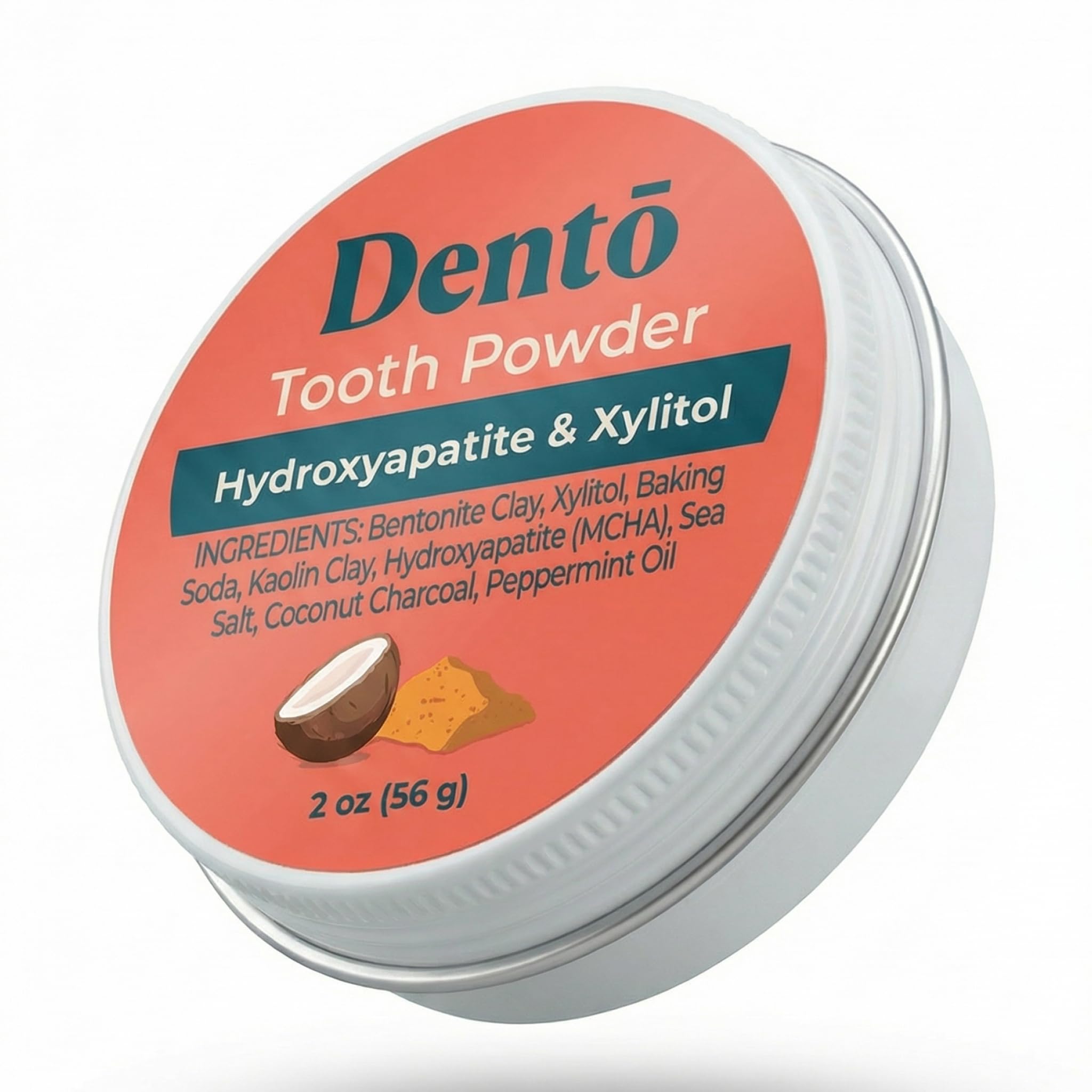 Support your daily oral health with Dento Hydroxyapatite Xylitol Tooth Powder, a premium mineral-based formula designed to help strengthen enamel, promote tooth remineralization, and support overall dental wellness. Featuring a powerful blendof Hydroxyapatite, Xylitol, Bentonite Clay, Kaolin Clay, Baking Soda, Coconut Charcoal, and Sea Salt, this tooth powder delivers a gentle yet effective cleanse for stronger, healthier teeth. Each serving provides a clean, fluoride-free formula made with naturally sourced ingredients - free from GMOs, artificial additives, or harsh chemicals offering a pure and natural approach to everyday oral care. Whether you aim to maintain enamel health, freshen your breath, or support natural whitening, Dento Tooth Powder provides a safe and effective solution for your daily routine. Perfect for those who value simplicity and natural wellness, this tooth powder remineralizing easily fits into any oral care regimen. Use it as a standalone toothpaste alternative or combine it with your favorite toothpaste for an extra boost of mineral support and freshness. Proudly formulated with integrity and crafted to the highest quality standards, Dento Hydroxyapatite Xylitol hydroxyapatite tooth powder helps you achieve a confident, healthy smile—naturally and effectively. How to Use: Add a small amount of Dento whitening powder to your toothbrush or mix with your favorite toothpaste. Brush gently for 2 minutes, ensuring even contact with all teeth. Rinse thoroughly and use daily for optimal results.Pure Ingredients, Thoughtful Craftsmanship: Crafted with clean, fluoride-free, and non-GMO ingredients free from artificial additives or preservatives. Dento powder toothpaste reflects our commitment to purity, integrity, and effective oral wellness. Easy Versatile Use: Add a small amount to your toothbrush or combine it with your favorite remineralizing toothpaste for a natural polishing boost. Ideal for daily brushing, DIY oral care recipes, or travel-friendly freshness. Gentle Cleanse: A blend of Bentonite and Kaolin Clay works together with Coconut Charcoal and Sea Salt to draw out impurities, remove buildup, and leave your mouth feeling refreshed and balanced after every use. Supports Healthy Remineralization: Formulated with Hydroxyapatite, this gentle hydroxyapatite powder helps replenish essential minerals in enamel, protecting against daily wear while supporting smooth, strong, and healthy teeth. Strengthens Whitens Naturally: Harness the power of Hydroxyapatite and Xylitol, two proven oral care minerals that help remineralizing gum, strengthen enamel, remove surface stains, and promote a naturally brighter smile, without harsh chemicals.