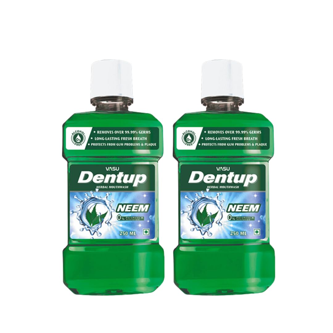 Dentup Herbal Mouthwash with Neem is a natural oral care solution crafted to deliver long-lasting freshness and complete oral hygiene. This herbal mouthwash combines the goodness of neem with other botanical extracts and essential oils to help maintain a healthy mouth, fight bad breath, and control hidden bacteria. Neem, known for its powerful antibacterial properties, makes this natural mouthwash an ideal choice for those seeking effective herbal oral care without the use of harsh chemicals. The refreshing formula works as a fresh breath mouthwash, targeting odor-causing bacteria to ensure your mouth stays clean and fresh all day. Specially formulated as an alcohol-free mouthwash, Dentup provides a non-burning, gentle rinse suitable for daily mouthwash use, even for those with sensitive gums. This fluoride-free mouth rinse is safe for long-term oral hygiene and supports a balanced and healthy mouth environment. Using Dentup Herbal Mouthwash is simple: rinse with 15mL of undiluted liquid for 30 seconds, then expel. For best results, avoid eating or drinking for 30 minutes after use. With regular use, you'll experience the benefits of plaque control mouthwash, healthier gums, and fresher breath. Perfect for anyone looking for a natural breath freshener, herbal mouth rinse, or daily herbal oral care routine, Dentup is your trusted choice for a cleaner, healthier, and fresher mouth - naturally.Easy Effective Use: Rinse with 15mL undiluted liquid for 30 seconds to enjoy healthier gums, cleaner teeth, and mint-fresh breath. Herbal anti-bacterial formula makes it safe for daily use and overall dental health. Gentle Daily Formula: Alcohol-free herbal mouthwash with gentle yet effective cleansing power. Perfect for sensitive gums, it offers fluoride-free mouthwash benefits while providing deep cleaning without burning sensation. Long-Lasting Freshness: This fresh breath mouthwash targets odor-causing bacteria, neutralizes bad breath, and ensures fresh breath all day. Ideal for morning and night use as part of your natural oral care routine. Neem Herbal Protection: Infused with neem mouthwash and essential oils, this antibacterial mouthwash reduces plaque, supports gum health, and promotes cavity protection while leaving a refreshing herbal taste after every rinse. Complete Oral Care: Dentup Herbal Mouthwash - Neem combines natural mouthwash benefits with herbal oral care to fight bad breath, freshen breath, kill bacteria, and maintain overall oral hygiene for daily use without alcohol.