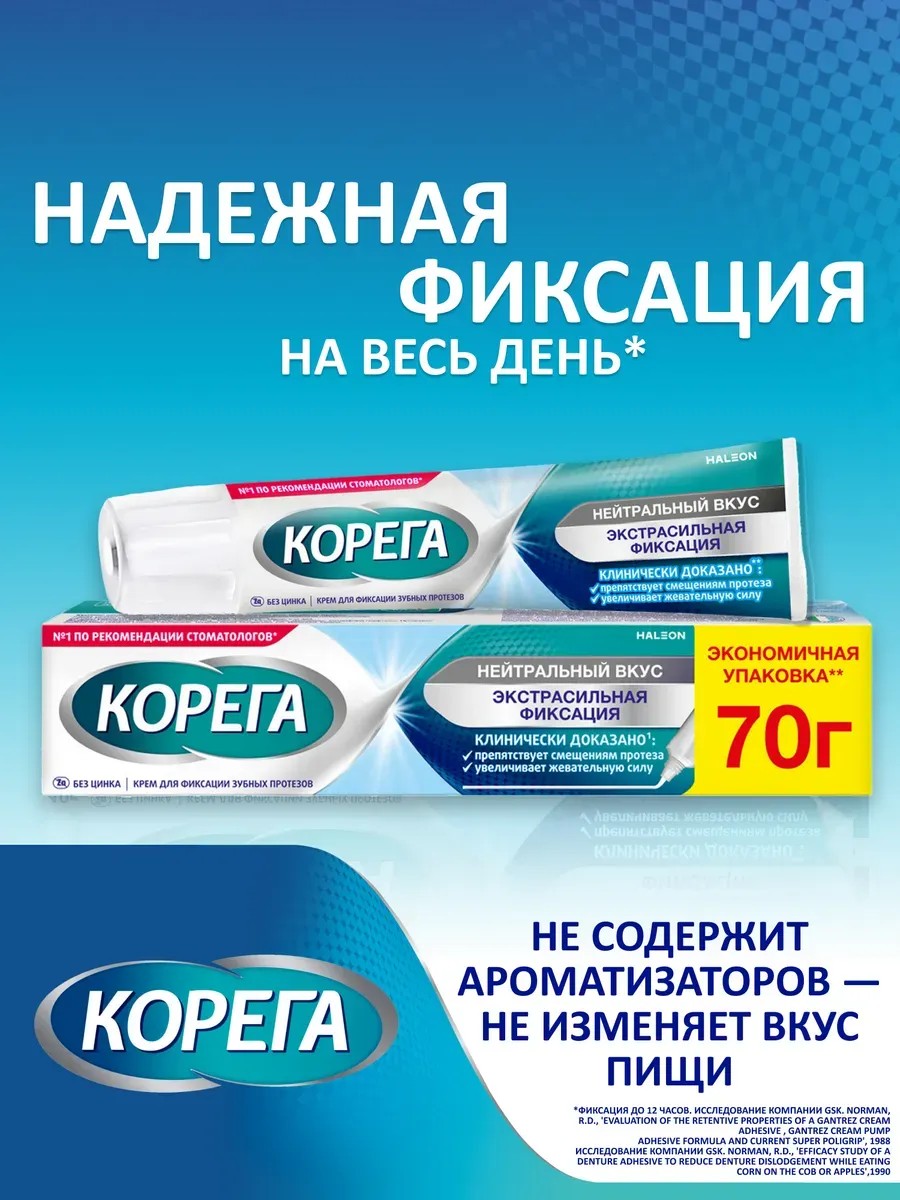 Живите полной жизнью, наслаждаясь любимыми делами — о съемном зубном протезе позаботится Корега.Средства для фиксации Корега обеспечивают надежное прилегание зубных протезов, помогает предотвращать попадание частичек пищи и сокращать раздражение дёсен1,2. Чувствуйте себя комфортно в течение всего дня — смело улыбайтесь, наслаждайтесь едой и разговаривайте.Крем для фиксации зубных протезов Корега Нейтральный вкус:●фиксирует протез в течение 12 часов3;●снижает количество частичек пищи, попадающих под протез, на 74%4,5;●не влияет на вкус пищи, так как не содержит вкусовые добавки;●не занимает много места благодаря компактному размеру.Позаботьтесь и о чистоте вашего протеза: используйте специальные таблетки для очищения зубных протезов Корега. Они удаляют бактерии, уменьшая образование зубного налёта и пятен6. Наслаждайтесь жизнью и занимайтесь любимыми делами, не думая о съемном зубном протезе.1. По сравнению с использованием без фиксирующего крема. Елаббаси Н. с соавт. «Эффективность адгезивных кремов для зубных протезов у тех, кто носит полные зубные протезы, по сравнению с теми, кто не использует адгезивные кремы для зубных протезов». Систематический обзор, Spec Care Dentist. 2021;41:251–270.2.2. Psillakis, J. J., Wright, R. F., Grbic, J. T. and Lamster, I. B. (2004) 'In Practice Evaluation of a Denture Adhesive Using a Gnathometer', Journal of Prosthodontics, 13(4), pp. 244-2503. Исследования компании GSK: Норман, Р. Д., 1988; Норман, Р. Д., 1990.4. По сравнению с неиспользованием фиксирующего средства на полном нижнем протезе через 1 час после нанесения.5. P. Fernandez et al. 'Denture Adhesive Reduces Food Entrapment Under Removable Full Dentures' , IADR, 20116. Исследование компании GSK. Dullea, C., 'Effectiveness of POLIDENT for PARTIALS Denture Cleanser on Food Stain Plaque Removal Utilizing a 5-Minute soak', 2011.