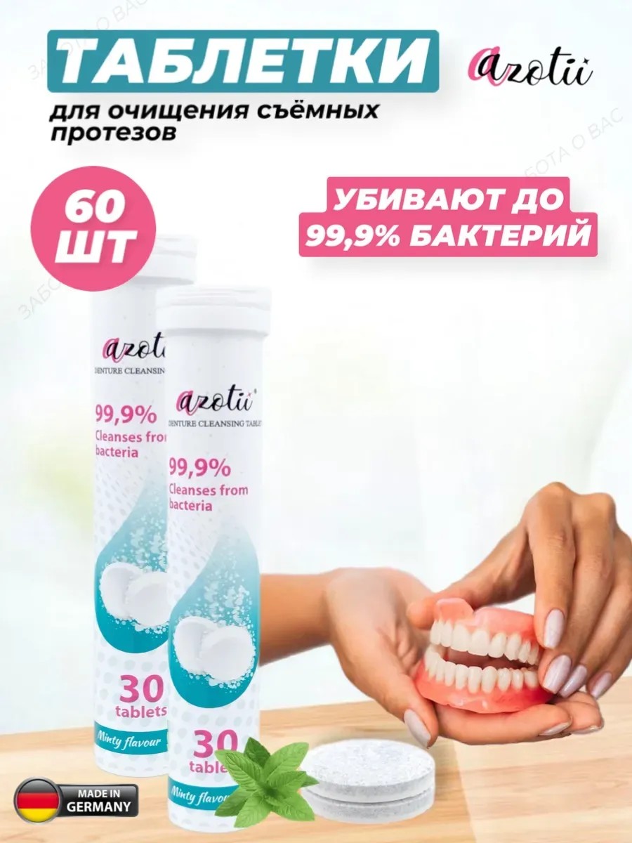 See the photo for the complete set! Beautiful and healthy teeth are what you strive for with orthodontic appliances. Your plastic plates, aligners, and other dentures will shine. Azotii cleaning tablets (like Korega) are perfect for this! This denture cleaner has a comprehensive effect: it removes dirt and plaque, whitens, has an antibacterial effect, and adds freshness. It's your all-in-one companion! This cleaner not only professionally achieves a mirror-like shine and transparency for your dentures, but also helps prevent and eliminate inflammation. Its tablet form makes it easy to use at home. Even kids can understand the instructions! Just one tablet in a glass of warm water, and the active solution for bad breath and stained dentures is ready. The manufacturer guarantees the safety of braces, splints, night guards (for sleeping, against snoring), and sports (boxing) mouthguards thanks to the use of the unique Clear technology. Gentle formula. No abrasives or aggressive substances in the composition! Only the best ingredients: sodium peroxymonosulfate, sodium percarbonate, peppermint oil, sodium lauryl sulfate, indigo, sodium benzoate, citric acid, etc. Daily use of effervescent tablets ensures deep cleaning of dentures. Effervescent tablets for teeth are also suitable for cleaning all types of orthodontic appliances (mouth guards, retainers, etc.). Instructions for use: 1. Clean the denture using a special denture cleaning brush. 2. Place the denture in a glass of warm water and add one tablet (the denture should be completely covered with water). 3. After 10-15 minutes, the denture becomes perfectly clean, hygienic and fresh. 4. Before installing the prosthesis, it must be rinsed in running water.