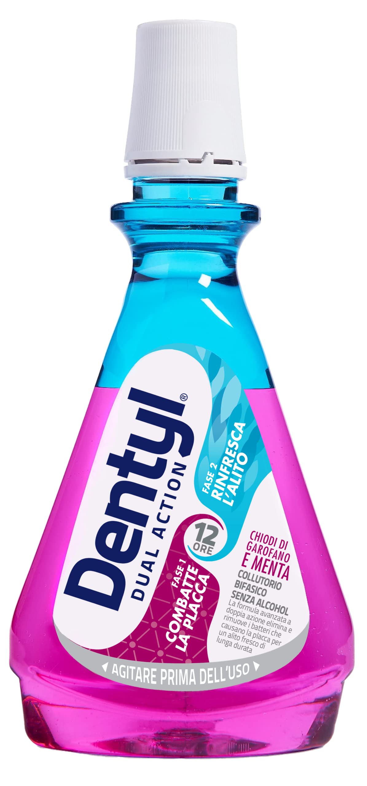 Dentyl Dual Action Biphasic Mouthwash has a unique, alcohol-free formula that combines two steps to provide whole-mouth protection for up to 12 hours. The aqueous phase with the powerful antimicrobial agent Cetylpyridinium Chloride (CPC) fights plaque, while the oily phase, containing Isopropyl Myristate (IPM), essential oils, and aromas, delivers a long-lasting fresh breath effect. When shaken, the two phases combine to activate. This unique formula physically removes plaque and bacteria from the mouth: you can see the results immediately in the sink when you rinse. INGREDIENTS Aqua, Isopropyl Myristate, Mentha Arvensis Extract, Sodium Benzoate, Xylitol, Sodium Saccharin, Eugenia Caryophyllus Leaf Oil, Cetylpyridinium Chloride, Sodium Fluoride, Limonene, Citric Acid, Sodium Phosphate, Eugenol, Linalool, CI 17200, CI 615656565656565, CI 420 90. Contains 0.05 sodium fluoride (225 ppm F). SAFETY WARNING Not suitable for children under 6 years of age. Do not swallow. Avoid contact with any plastic. Store at room temperature. Do not use if the bottle seal is broken. Do not use if you are hypersensitive to any of the ingredients. See moreMade in Italy. Suitable for children aged 6 and up. Alcohol-free, does not cause a drying sensation. Contains sodium fluoride, which strengthens teeth. Provides a fresh breath effect that lasts up to 12 hours. Contains cetylpyridinium chloride (CPC), a powerful antimicrobial agent that helps promote healthy teeth and gums. Completes hygiene even where the toothbrush can't reach – you can see Dentyl working instantly when you rinse. Eliminates bacteria and removes plaque from teeth and gums.Dentyl Dual Action Rince-bouche, clous de girofle et menthe 500 ml Boîte de 6 pièces Clous de girofle et menthe 500 ml (Confezione da 6)DESCRIPTION DU PRODUIT DESCRIPTION DU PRODUIT Le bain de bouche biphasique Dentyl Dual Action a une formulation unique, sans alcool, qui combine deux étapes pour fournir une protection de l'ensemble de la bouche qui dure jusqu'à 12 heures. La phase aqueuse avec le puissant agent antimicrobien Cetylpyridinium Chloride (CPC) combat la plaque, tandis que la phase huileuse, contenant Isopropyl Myristate (IPM), huiles essentielles et arômes, apporte un effet d'haleine fraîche à longue durée. Lorsqu'ils sont agités, les deux étapes se combinent pour s'activer. Cette formulation unique élimine physiquement la plaque et les bactéries de la bouche : vous pouvez voir les resultats immédiatement dans l'évier, lorsque vous faites le rinçage. INGRÉDIENTS Aqua, Isopropyl Myristate, Mentha Arvensis Extract, Sodium Benzoate, Xylitol, Sodium Saccharin, Eugenia Caryophyllus Leaf Oil, Cetylpyridinium Chloride, Sodium Fluoride, Limonene, Citric Acid, Sodium Phosphate, Eugenol, Linalool, CI 17200, CI 615656565656565 , CI 420 90 Contient du fluoride de sodium 0,05 (225 ppm F). AVERTISSEMENT DE SÉCURITÉ Ne convient pas aux enfants de moins de 6 ans. Ne pas avaler. Évitez tout contact avec n'importe quel plastique. Conserver à température ambiante. Ne pas utiliser si le sceau de la bouteille est cassé. Ne pas utiliser en cas d'hypersensibilité à n'importe quel ingrédient. Voir plusFabriqué en Italie. Convient aux enfants à partir de 6 ans. Sans alcool, n'apporte pas de sensation de sécheresse. Contient du fluorure de sodium qui renforce les dents. Apporte un effet d'haleine fraîche qui dure jusqu'à 12 heures. Contient du chlorure de cetylpyridinium (CPC), un puissant agent antimicrobien qui aide à favoriser le bien-être des dents et des gencives. Complète l'hygiène même là où la brosse à dents ne vient pas – vous pouvez voir Dentyl fonctionner instantanément, lorsque vous effectuez le rinçage. Élimine les bactéries et élimine la plaque dentaire des dents et des gencives.