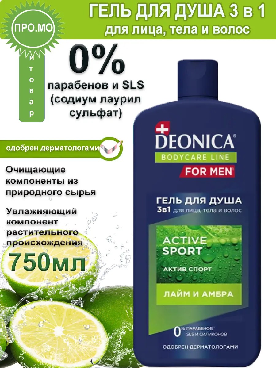 DEONICA Гель для душа 3 в 1 лайм и амбра, 750мл