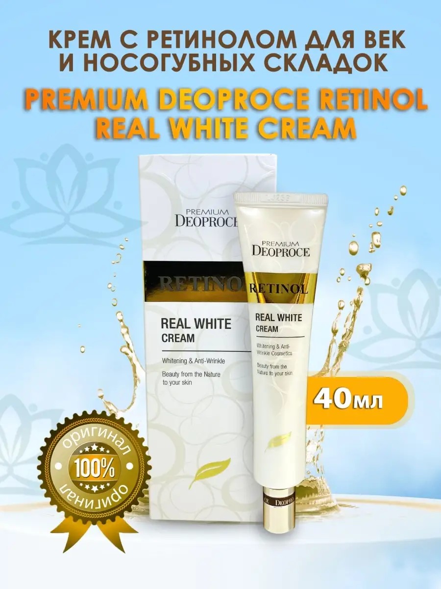Anti-aging cream with retinol for eyelids and nasolabial folds **Premium Deoproce Retinol Real White Cream.** The cream smoothes and firms the skin around the eyes and nasolabial area, enhances collagen production in the epidermis, restores skin elasticity, and brightens dullness under the eyes. The cream stimulates cell regeneration, leaving the skin under the eyes looking youthful, energized, and healthy. Directions: Apply the cream to the area around the eyes and nasolabial folds and allow to absorb. Volume: 40 ml. Ingredients are shown in the photo in the carousel.