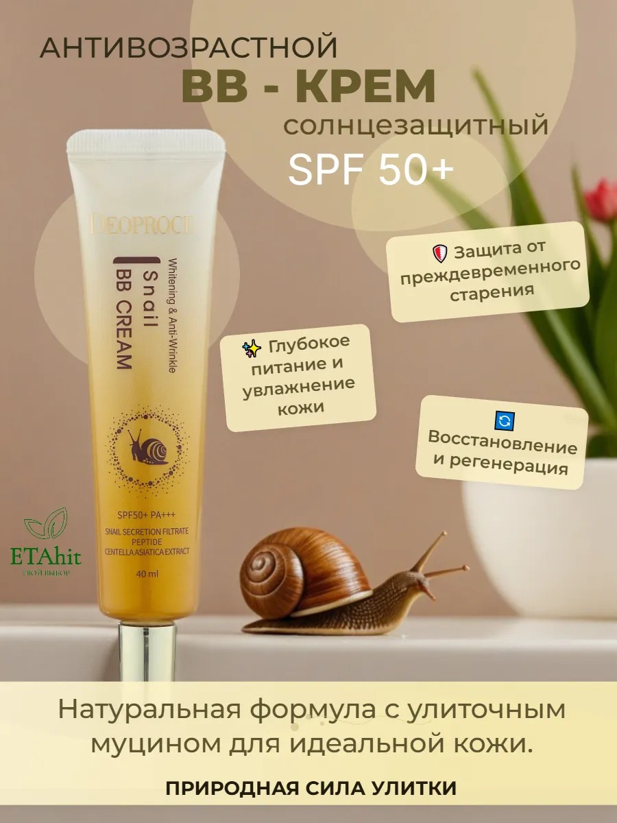 DEOPROCE ANTI-WRINKLE SNAIL BB CREAM SPF50+PA+++ Anti-aging sunscreen Korean BB cream with snail mucin, 40ml. Today we want to introduce you to a wonderful product – a Korean BB cream from DEOPROCE. If you're looking for the perfect product for creating a flawless makeup look, this BB cream is your best choice! BB cream is a multifunctional facial product that combines skin care and makeup. It is the ideal solution for those who want to look attractive and well-groomed every day. DEOPROCE BB cream is a unique product developed using advanced technologies and based on ancient cosmetic recipes. One of the main advantages of this Korean BB cream is its ability to provide comprehensive facial skin care. With active ingredients such as hyaluronic acid, green tea extract, and aloe vera, DEOPROCE BB Cream hydrates and nourishes skin, leaving it smoother and more elastic. Additionally, thanks to its SPF filter, this cream protects skin from the harmful effects of UV rays, preventing premature aging and pigmentation. DEOPROCE BB Cream has a lightweight texture that applies easily and absorbs quickly. It creates a natural yet luxurious coverage, concealing skin imperfections such as redness, age spots, and fine lines. This BB Cream adapts to your skin tone, providing a natural and flawless look without creasing or leaving a greasy residue. Composition: WATER, TITANIUM DIOXIDE, ETHYLHEXYL METHOXYCINNAMATE, CYCLOPENTASILOXANE, CAPRYLIC/CAPRIC TRIGLYCERIDE, PHENYL TRIMETHICONE, CETYL PEG/PPG-10/1 DIMETHICONE, ETHYLHEXYL SALICYLATE, NIACINAMIDE, OCTOCRYLENE, CETYL ETHYLHEXANOATE, QUATERNIUM-18 BENTONITE, SORBITAN OLIVATE, BEESWAX, CYCLOHEXASILOXANE, BUTYLENE GLYCOL, 4-METHYLBENZYLIDENE CAMPHOR, BIS-ETHYLHEXYLOXYPHENOL METHOXYPHENYL TRIAZINE, TRIMETHYLSILOXYSILICATE, MAGNESIUM