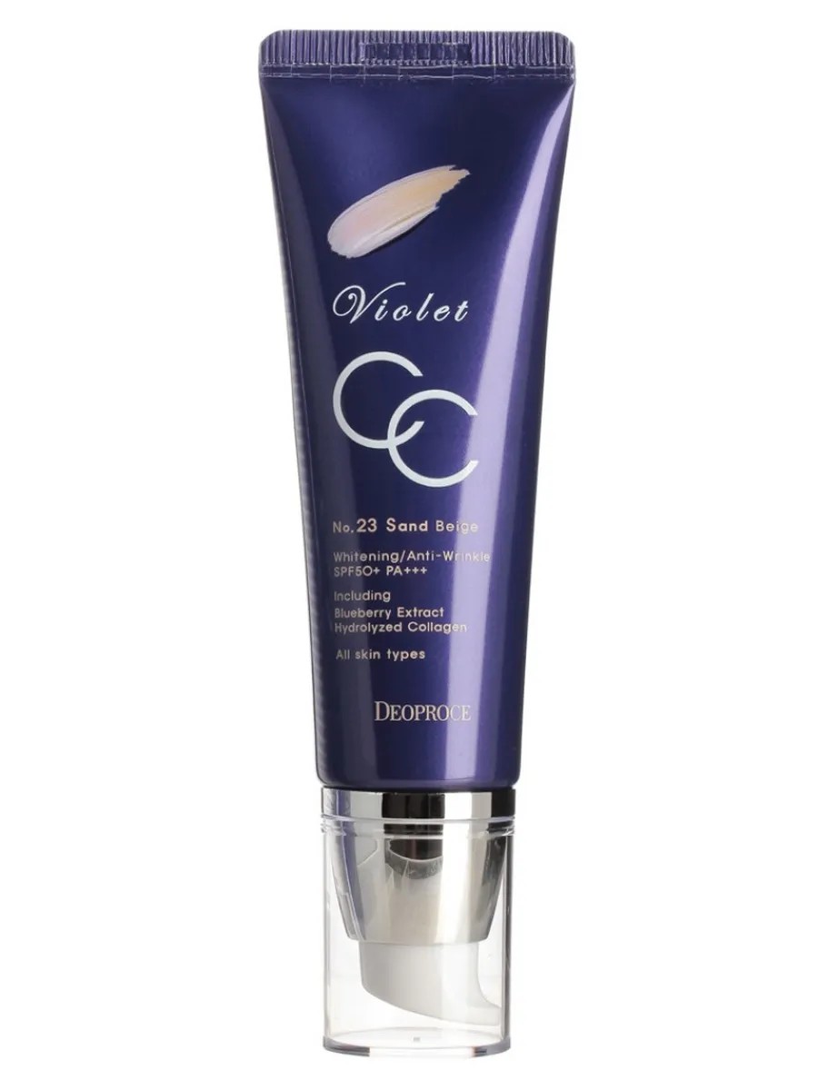 CC - крем для лица Deoproce "Violet" тон 23, 50 г. CС крем для лица при нанесении быстро подстраивается под тон кожи, увлажняет и разглаживает тон кожи, защищает кожу от УФ лучей. Экстракт черники увеличивает эластичность кожи, оказывает антиоксидантное действие и придает коже упругость; гидролизованный коллаген удерживает влагу в коже. Подходит для всех типов кожи. Применение: выдавите с помощью помпы на спонж или на кончики пальцев, нанесите на кожу, равномерно распределяя