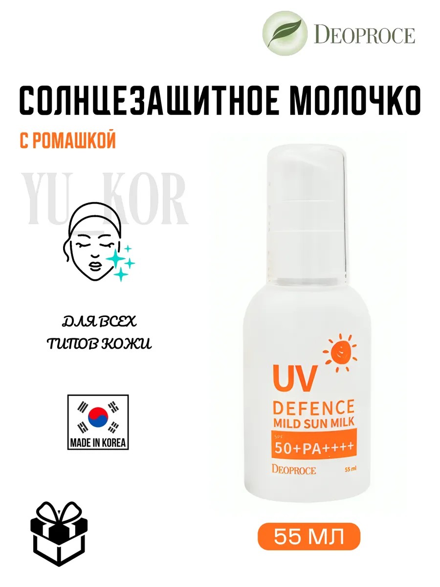 The refreshing sunscreen milk with chamomile, Deoproce UV Defense Mild Sun Milk SPF50+ PA++++, protects against UVA and UVB rays, preventing sunburn, pigmentation, and photoaging.