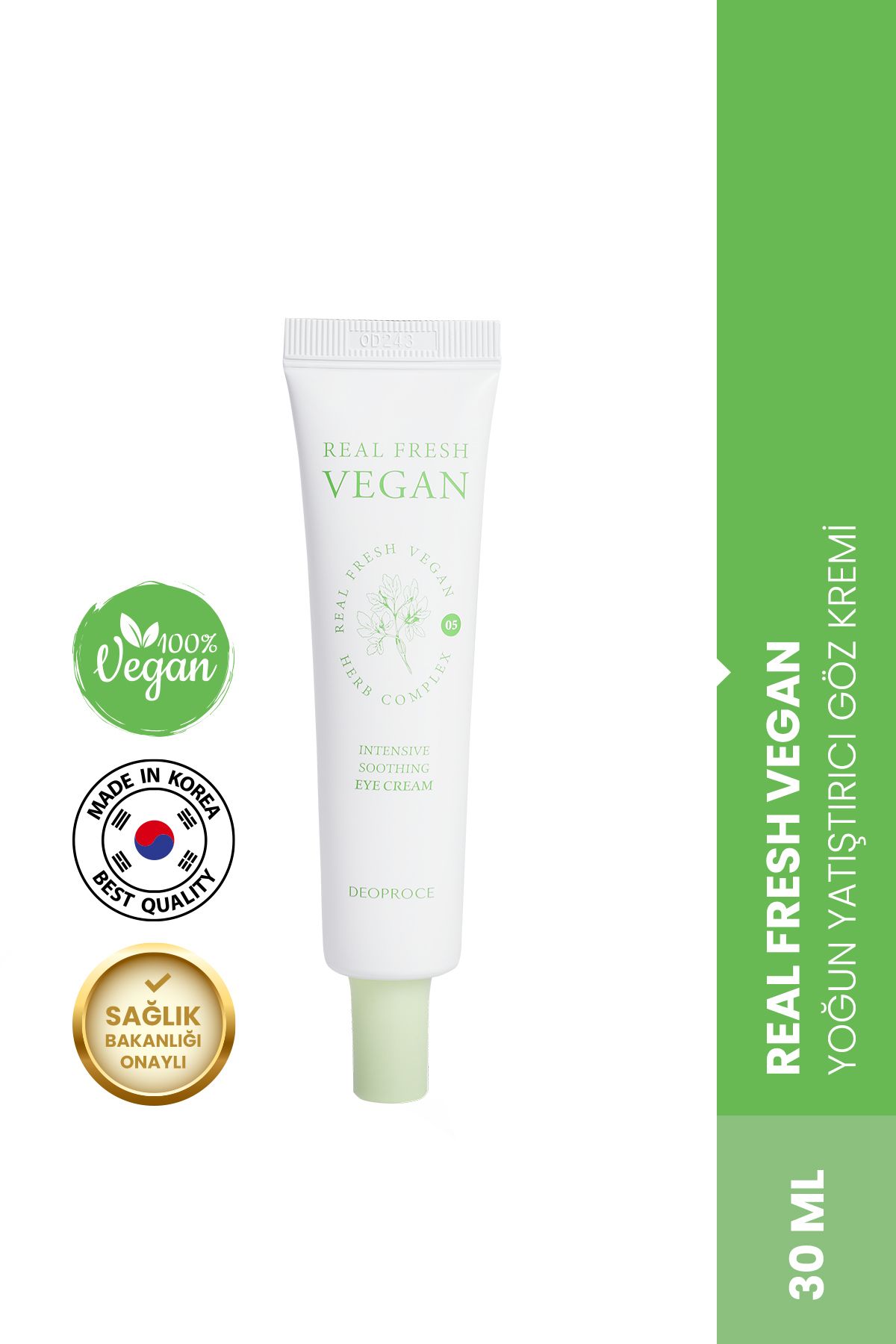 Yogun Tazeleyici ve Yatistirici Real Fresh vegan göz kremi Eve Vegan Sertifikasina sahiptir. Vegan förmülü ile cildinizi canlandirir. Konsantre Bitki Özü ile Cildinizi Yogun Nemlendirir. Zararli içerik ve yapay koku içermez. Hassas ciltler güvenle kullanabilir, Sadece dogal kokular kullanilmistir. Bitkisel özler:Yasemin, Lavanta, Ada Çayi, Papatya, Kekik, Nane, Biberiye ve Hadan. Göz Çevresi için de etkili nemlendirme vardir. Göz Çevresi ve alti için bitkisel özler içeren nemlendirici krem, Epidermisi tazeler ve besler,mimik çizgilerini yumusatir, Koyu halka görünümünü aydinlatmada etkilir.