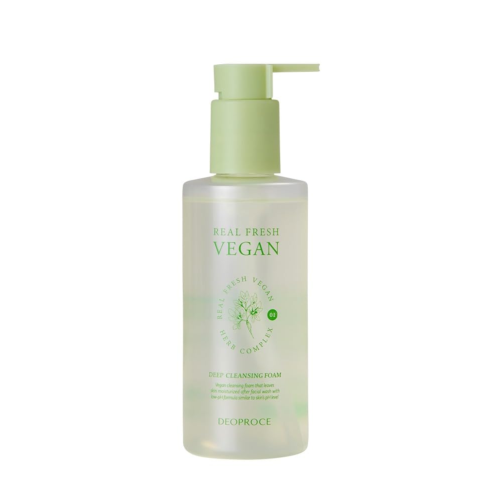 Reveal Your Skin's Natural Radiance with Deoproce Real Fresh Vegan Deep Cleansing Foam Experience the purity of vegan skincare with Deoproce Real Fresh Deep Cleansing Foam, a gentle yet effective cleanser that washes away impurities while nurturing your skin. This Korean skincare marvel is infused with botanical extracts and hydrating allantoin to leave your complexion feeling refreshed, balanced, and beautifully clear. Perfect for daily use, this deep cleansing foam respects your skin's natural oils, ensuring a comfortable and revitalized feel after every wash. Discover the difference of a truly gentle cleanse. Deoproce Real Fresh Vegan Deep Cleansing Foam is expertly formulated to remove dirt, makeup, and daily grime without stripping your skin's essential moisture. Enriched with rosemary, jasmine, chamomile, sage, and lavender extracts, it soothes, softens, and refines your skin's texture, promoting a brighter and more even skin tone. Embrace a healthier-looking complexion with every wash, and make this vegan cleansing foam your new skincare staple. Key Features: Deeply Cleanses Pores: Effectively removes impurities and unclogs pores for a clearer complexion. Maintains Skin's Moisture: Gently cleanses without stripping natural oils, keeping skin hydrated and comfortable. Soothes and Softens: Enriched with botanical extracts to calm irritation and leave skin feeling soft and supple. Improves Complexion: Tones and refines skin texture, promoting a brighter and more even skin tone. Vegan Gentle Formula: Crafted with plant-based ingredients, suitable for even sensitive skin types. Key Ingredients: Rosemary Extract: Known for its soothing and softening properties, promoting healthy skin. Jasmine Extract: Helps improve skin complexion and reduce inflammation for a radiant glow. Chamomile Extract: Calms and soothes irritated skin, reducing redness and sensitivity. Sage Extract: Restores skin balance and helps minimize redness for an even tone. Lavender Extract: Strengthens skin circulation, reduces redness, and helps to tighten pores. Allantoin: Provides deep hydration and soothes dry skin, enhancing skin suppleness. How to Use: Begin with damp skin. Dispense a small amount of cleansing foam into your palms. Gently massage onto face in circular motions until a rich, thick lather forms. Rinse thoroughly with lukewarm water and pat dry. Use daily, in the morning and evening, for best results. Elevate your daily cleansing ritual with Deoproce Real Fresh Vegan Deep Cleansing Foam. More than just a cleanser, it's a step towards achieving a balanced, hydrated, and radiantly healthy complexion, powered by nature and perfected by Korean skincare expertise.✓ Daily Gentle Cleanser: Mild and non-irritating, perfect for incorporating into your morning and night skincare routine. ✓ Improves Skin Tone: Lavender and sage extracts help refine pores and promote a brighter, more even complexion. ✓ Soothing Plant Extracts: Infused with rosemary, chamomile, and jasmine to calm and soften sensitive skin. ✓ Hydrating Vegan Formula: Gently cleanses without stripping essential oils, maintaining skin's natural moisture balance. ✓ Deep Pore Cleansing: Effectively washes away daily impurities and unclogs pores for a fresh, clear complexion.