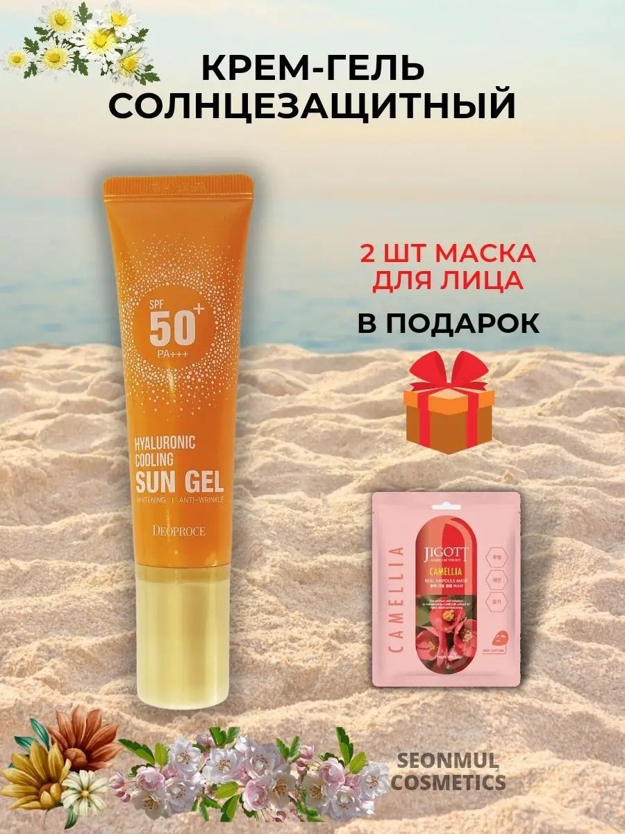 В подарок 2 тканевые маски бренда Jigott.Солнцезащитный крем для лица от загара 50 Deoproce Hyaluronic Sun Gel SPF50+ надежная защита от солнца, быстро впитывается без липкого эффекта. Увлажняющий крем от солнца с spf50 и гиалуроновой кислотой можно использовать для лица и тела, защищая от негативного воздействия солнечных лучей. Уход за кожей с spf становится легче, благодаря гиалуруновой кислоте, входящей в состав крема для лица и тела, формирует на поверхности кожи непрерывную тонкую пленку, которая сохраняет естественную влажность кожи, не нарушая газообмен с окружающей средой. Имеет антивозрастной и отбеливающий эффект против пигментации, борется против морщин, вызванных солнечными лучами. Увлажняющий крем из раздела корейские бренды.