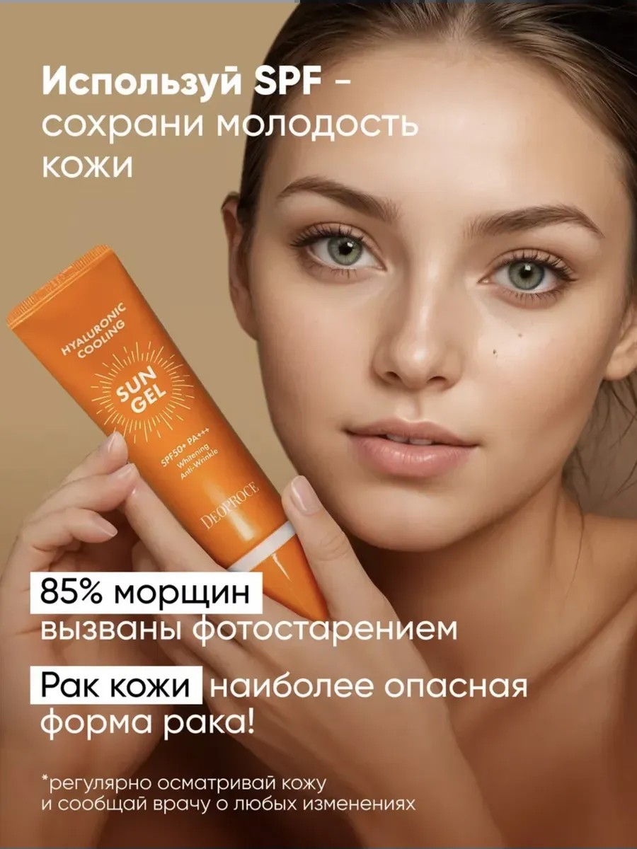 Солнцезащитный крем от загара спф 50 от известного корейского бренда Deoproce Hyaluronic Sun Gel тройного действия: отбеливание, разглаживание морщин и защита от ультрафиолета. Это Ваша надежная защита от солнца, главного провокатора старения и пигментных пятен. Он удобно наноситься с помощью дозатора и быстро впитывается без липкого эффекта и не выбеливает, сохраняя здоровый тон. Увлажняющий крем от солнца с фактором spf 50+ и PA+++ с гиалуроновой кислотой можно использовать для лица и тела, а также зоны декольте. Защищая от негативного воздействия ультрафиолетовых (УФ) лучей: uva (УФ-А) и uba (УФ-В), он сохраняет Вашу красоту. Уход за кожей становится легче, благодаря уникальной формуле спф для лица с гиалуроновой кислотой, церамиду и ювенильной водой с острова Чеджудо. Одним из важных компонентов является экстракт эвкалипта голубого. Он дополнительно успокаивает и охлаждает, даря ощущение прохлады. Это профессиональное косметическое средство обеспечивает на поверхности кожи непрерывную тонкую пленку, сохраняя естественную увлажненность лица и тела, не нарушая газообмен с окружающей средой.