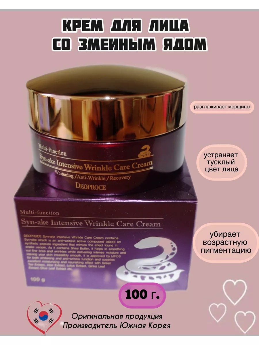 Интенсивный крем DEOPROCE Змеиный яд Multi function Syn Ake Intensive Wrinkle Care Cream оказывает активное антивозрастное действие: разглаживает мимические морщины, устраняет тусклый цвет лица и возрастную пигментацию, увлажняет кожу и восстанавливает ее эластичность и гладкость за счет пептида Syn Ake , разработанный швейцарской компанией Pentapharm. Его действие аналогично действию ботокса этот пептид блокирует передачу нервных импульсов и мышечные сокращения, за счет чего расслабляется лицевая мускулатура и разглаживаются мелкие мимические морщины в области лба и носогубных складок. Аденозин разглаживает рельеф кожи и мелкие мимические морщины, ниацинамид осветляет пигментацию, регулирует баланс влажности в эпидермисе и оказывает антивозрастное действие.