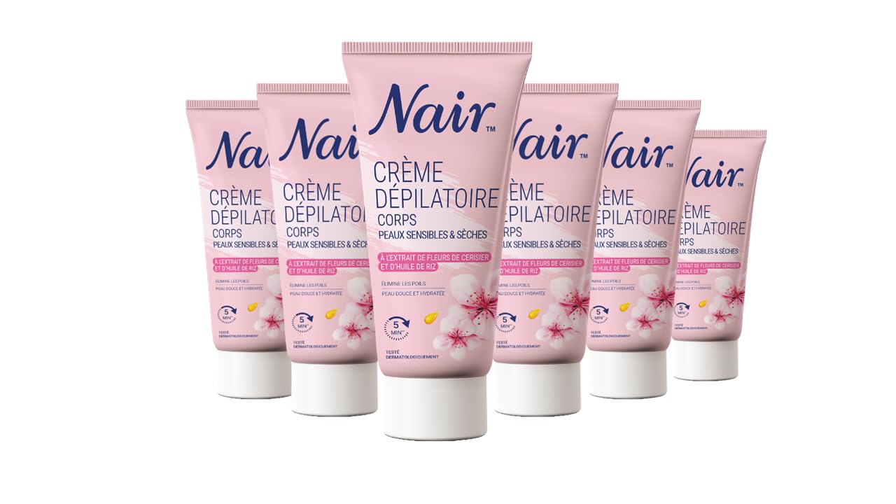 : This Nair hair removal cream with cherry blossom extract and rice oil has been specially formulated for hair removal on dry and sensitive skin. Its smooth cream texture is easy to apply and rinse off, and works in just 5 to 6 minutes (depending on hair density, you can leave it on for a few more minutes, but no more than 10 minutes in total). Effective on short hairs, this hair removal cream offers slower and less coarse regrowth than shaving. Dermatologically tested. Ingredients AQUA, PARAFFINUM LIQUIDUM, CALCIUM THIOGLYCOLATE, CETEARYL ALCOHOL, CALCIUM HYDROXIDE, SODIUM HYDROXIDE, CETETH-20, SILICA, SYNTHETIC BEESWAX, PARFUM, ORYZA SATIVA BRAN OIL, HELIANTHUS ANNUUS SEED OIL, GLYCERIN, PRUNUS SERRULATA FLOWER EXTRACT, CITRIC ACID, PHALAENOPSIS AMABILIS EXTRACT, SODIUM BENZOATE, POTASSIUM SORBATE, TOCOPHEROL P.when('A').execute(function(A) { A.on('a:expander:toggle_description:toggle:collapse', function(data) { window.scroll(0, data.expander. expander[0].offsetTop-100) Instructions for Use: 1. Stir the depilatory cream. 2. Apply the depilatory cream to the desired area using the spatula. 3. Leave on for 5 to 6 minutes (or up to 10 minutes for thicker hair). 4. Rinse the depilatory cream off thoroughly. Safety Warning: PRECAUTIONS FOR USE: Always follow the instructions for use. Irritation or an allergic reaction may occur in some people, even after the first use without adverse effects. Therefore, before each use, test on a limited area of ??the skin to be depilated, following the instructions for use. If after 24 hours the skin appears normal, proceed with the complete hair removal. Do not use on the head, face, nose, ears, around the eyes, nipples, perianal, or genital areas. Do not use on irritated, burned, inflamed, or cut skin, or skin that has previously reacted to depilatory creams. If irritation occurs, discontinue use immediately, remove the product, rinse the area with cold water, and consult a doctor. Avoid contact with eyes. In case of contact with eyes, rinse immediately and thoroughly with lukewarm water and consult a specialist. Avoid contact with materials or surfaces. This product may make surfaces slippery. Store at room temperature crystals may form at low temperatures. Contains salts of thioglycolic acid. Contains an alkaline agent. KEEP OUT OF REACH OF CHILDREN. Do not swallow. See moreIncludes: Pack of 6 tubes of Nair hair removal cream for dry and sensitive skin and 1 spatula. Fast: Works in 5 to 6 minutes (up to 10 minutes depending on hair density). Easy: Smooth cream texture that is easy to apply and rinse. Soft skin: Once rinsed, skin is perfectly clean and soft for optimal comfort. Effective: Effectively removes hair for gentle hair removal. Hair removal cream for dry and sensitive skin, with cherry blossom and rice oil extracts.Description du produit Cette crème dépilatoire Nair aux extraits de fleur de cerisier et d'huile de riz a été spécialement formulée l'épilation des peaux sèches et sensibles. Sa texture crème onctueuse est facile à appliquer et à rincer et agit en seulement 5 à 6 minutes (selon la pilosité, vous pouvez la laisser agir quelques minutes de plus, sans dépasser 10 minutes en tout). Efficace sur les poils courts, cette crème dépilatoire offre une repousse plus lente et moins drue qu'avec un rasoir. Testée sous contrôle dermatologique. Ingrédients AQUA, PARAFFINUM LIQUIDUM, CALCIUM THIOGLYCOLATE, CETEARYL ALCOHOL, CALCIUM HYDROXIDE, SODIUM HYDROXIDE, CETETH-20, SILICA, SYNTHETIC BEESWAX, PARFUM, ORYZA SATIVA BRAN OIL, HELIANTHUS ANNUUS SEED OIL, GLYCERIN, PRUNUS SERRULATA FLOWER EXTRACT, CITRIC ACID, PHALAENOPSIS AMABILIS EXTRACT, SODIUM BENZOATE, POTASSIUM SORBATE, TOCOPHEROL P.when('A').execute(function(A) { A.on('a:expander:toggle_description:toggle:collapse', function(data) { window.scroll(0, data.expander. expander[0].offsetTop-100) }) }) Mode d'emploi 1. Remuer la crème dépilatoire. 2. Appliquer la crème dépilatoire sur la zone désirée en utilisant la spatule. 3. Laisser poser pendant 5 à 6 minutes (ou jusqu'à 10 minutes pour une pilosité plus épaisse). 4. Rincer la crème dépilatoire soigneusement. Avertissement De Sûreté PRÉCAUTIONS D'EMPLOI : Toujours suivre le mode d'emploi. Une irritation ou une réaction allergique peut survenir chez certaines personnes, même après une première utilisation sans effet indésirable. Par conséquent, avant chaque utilisation, faire un essai sur une partie limitée de la zone à épiler en suivant le mode d'emploi. Si après 24 heures l'apparence de la peau semble normale, procéder à l'épilation complète. Ne pas utiliser sur la tête, le visage, le nez, les oreilles, autour des yeux, les mamelons, les zones péri-anales et génitales. Ne pas utiliser sur une peau irritée, brûlée, enflammée ou coupée ou ayant déja réagi, auparavant, lors de l'utilisation de crèmes dépilatoires. En cas d'irritation, cesser immédiatement l'utilisation, retirer le produit, rincer la zone à l'eau froide et consulter un médecin. Éviter le contact avec les yeux. En cas de contact avec les yeux, laver immédiatement et abondamment à l'eau tiède et consulter un spécialiste. Éviter tout contact avec des matériaux ou des surfaces. Ce produit peut rendre les surfaces glissantes. Conserver à température ambiante, des cristaux peuvent se former à basse température. Contient des sels de l'acide thioglycolique. Contient un agent alcalin. CONSERVER HORS DE PORTÉE DES ENFANTS. Ne pas avaler. Voir plusInclus: Lot de 6 tubes de crèmes dépilatoires Nair peaux sèches et sensibles et 1 spatule. Rapide: Agit en 5 à 6 minutes (jusqu'à 10 minutes selon la pilosité). Facile: texture crème onctueuse facile à appliquer et à rincer. Peau douce: une fois rincée, la peau est parfaitement nette et douce pour un confort optimal. Efficace: Elimine les poils efficacement pour une épilation tout en douceur. Crème dépilatoire Corps peaux sèches et sensible, aux extraits de fl