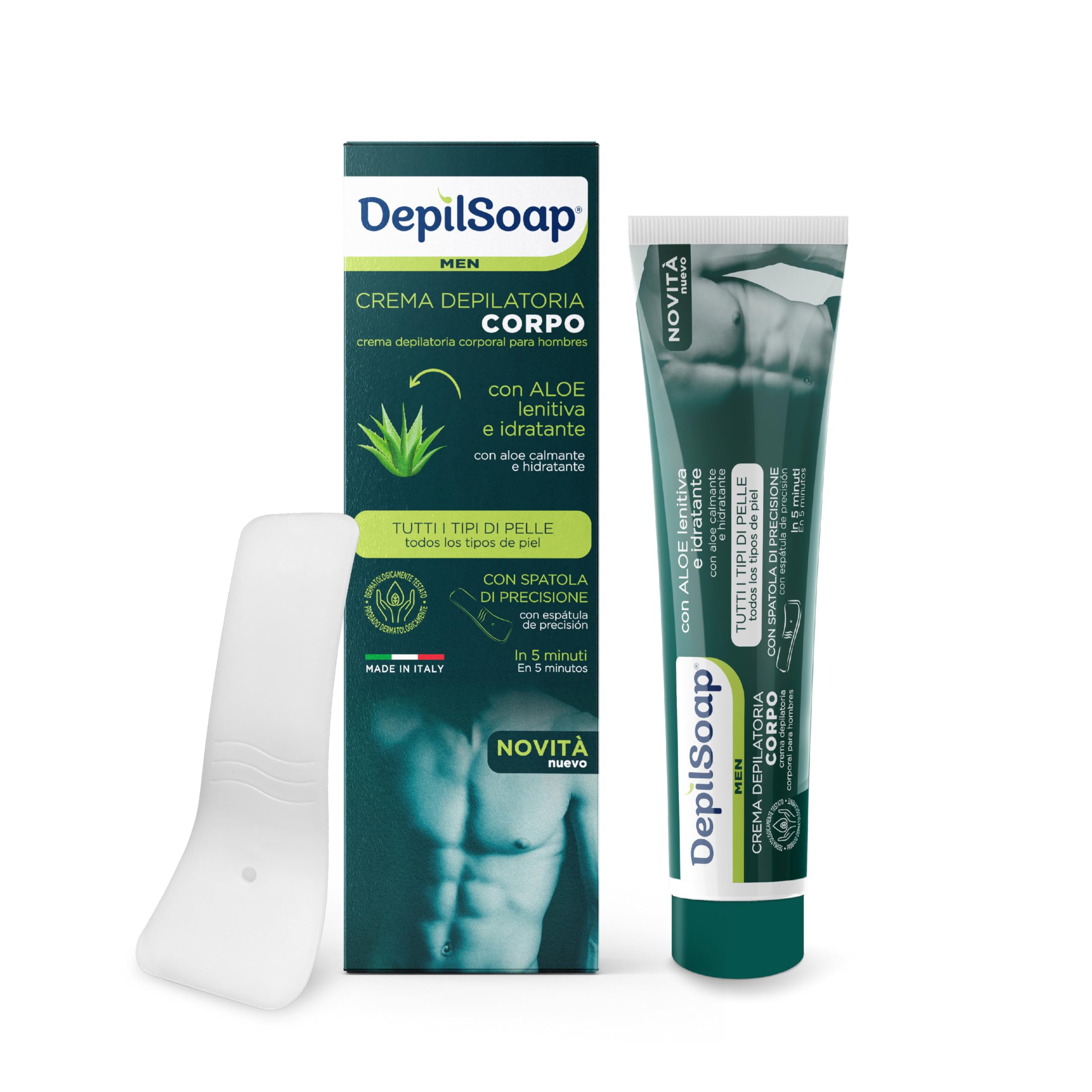 From the long-standing DepilSoap expertise comes the Men's Hair Removal Cream. Practical and easy to use, it works in minutes to completely remove unwanted hair from the entire body. With DepilSoap Men's Hair Removal Cream, a few simple steps are all it takes to achieve clean, smooth skin. Its delicate fragrance makes application even more pleasant. The ammonia-free formula is suitable for all skin types. This hair removal cream is enriched with natural, functional ingredients such as aloe and vitamin E, which combat redness and irritation thanks to their soothing, moisturizing, and calming properties. Directions for use: Spread the cream with the special spatula included in the box until the area to be treated is completely covered. Leave on for a maximum of 5 to 8 minutes, until, upon attempting to partially remove the cream, no hair is visible. Do not leave on for more than 8 minutes. Remove any remaining cream using the spatula. Rinse thoroughly with lukewarm water and pat dry. If you experience burning or itching, remove the cream immediately by rinsing with lukewarm water. Carefully follow the warnings and instructions for use. If using this product for the first time, it is always advisable to perform a patch test before application by applying a small amount of product to an area to be treated. If no skin reaction occurs after 24 hours, you can proceed with using the product according to the instructions on the packaging. INGREDIENTS Aqua, Calcium Thioglycolate Hydroxide, Cetearyl Alcohol, PEG-8 Stearate, Polyglyceryl-3 Diisostearate, Ceteareth-20, Glycerin, Paraffinum Liquidum, Hydrogenated Starch Hydrolysate, Sodium Hydroxide, Glyceryl Oleate, Aloe Ferox Leaf Juice Extract, Tocopheryl Acetate, Lecithin, Physical Acid, Parfum, Titanium Dioxide, PEG-150 Deyl Alcohol SMDI Copolymer, Propylene Glycol, Caprylic Triglyceride, Cinnamyl Alcohol, Geraniol, Alpha-Isomethyl Ionone, Linalool INSTRUCTIONS FOR USE Spread the cream with the special spatula until the area to be depilated is completely covered. Leave on for a maximum of 5 to 8 minutes, until, upon attempting to partially remove the cream, no hair removal is observed to be completely successful. Do not leave on for more than 8 minutes. Remove any remaining cream using the spatula. Rinse thoroughly with lukewarm water and pat dry. If you experience burning or itching, remove the cream immediately by rinsing with lukewarm water. Carefully follow the warnings and instructions for use. If using this product for the first time, it is always advisable to perform a patch test before application by applying a small amount of product to an area to be treated. If no skin reaction occurs after 24 hours, you can proceed with using the product according to the instructions on the packaging. SAFETY WARNING For external use only See moreDermatologically tested: Effective, easy to use, and safe for your skin, EpilSoap men's hair removal cream makes hair removal a pleasant moment of self-care. This product, like the entire EpilSoap hair removal line, is dermatologically tested. Ammonia-free: The ammonia-free formula is suitable for all skin types. This men's hair removal cream is enriched with natural, functional ingredients such as aloe and vitamin E, which prevent redness and irritation thanks to their soothing, moisturizing, and calming properties. Precision spatula: Inside the box, you'll find a handy precision spatula, which makes it even easier to spread the product to completely cover the area to be treated. After use, remove any remaining hair removal cream with the spatula. Rinse thoroughly with warm water and pat dry. Maximum effectiveness: With DepilSoap men's hair removal cream, a few simple steps are all it takes to achieve clean, smooth skin. Practical and easy to use, it works in minutes, completely removing unwanted hair from the entire body. Features: Drawing on DepilSoap's long-standing expertise, this men's hair removal cream features a formula specifically designed for male hair removal and body care. Say goodbye to unwanted hair and ingrown hairs with quick and easy application. Its delicate fragrance makes the application process even more pleasant.Depilsoap - Crème dépilatoire pour homme – Paquet de 150 ml – Convient à tous les types de peau – Sans ammoniaque – Enrichi en ingrédients naturels tels que l'aloès et la vitamine EDESCRIPTION DU PRODUIT DESCRIPTION DU PRODUIT De l'expérience historique DepilSoap naît la crème dépilatoire Men, pratique et facile à utiliser, agit en quelques minutes en éliminant complètement les poils superflus de tout le corps. Avec la crème dépilatoire pour homme DepilSoap il suffit de quelques étapes simples pour avoir une peau propre et douce. Son parfum délicat rend l'application du produit encore plus agréable. La formulation sans ammoniaque est indiquée pour tous les types de peau. Cette crème épilatoire est enrichie en ingrédients naturels fonctionnels tels que l'aloe et la vitamine E, qui luttent contre l'apparition de rougeurs et d'irritations grâce à leurs propriétés apaisantes, hydratantes et apaisantes. Mode d'utilisation : étendre la crème avec la spatule spéciale contenue à l'intérieur de la boîte, jusqu'à recouvrir complètement la zone à épiler. Laisser agir pendant 5 à 8 minutes maximum, jusqu'à ce que, en essayant de retirer partiellement la crème, il n'est pas observé que l'épilation est parfaitement réussie. Ne pas dépasser 8 minutes d'application. Retirez la crème restante en aidant avec la spatule. Rincer abondamment à l'eau tiède et sécher sans frotter la peau. Si vous ressentez des sensations de brûlure ou des démangeaisons, retirez immédiatement la crème en rinçant à l'eau tiède. Suivez attentivement les avertissements et les instructions d'utilisation. Si le produit est utilisé pour la première fois, il est toujours conseillé d'effectuer un test de sensibilité avant l'application, en appliquant une petite qu