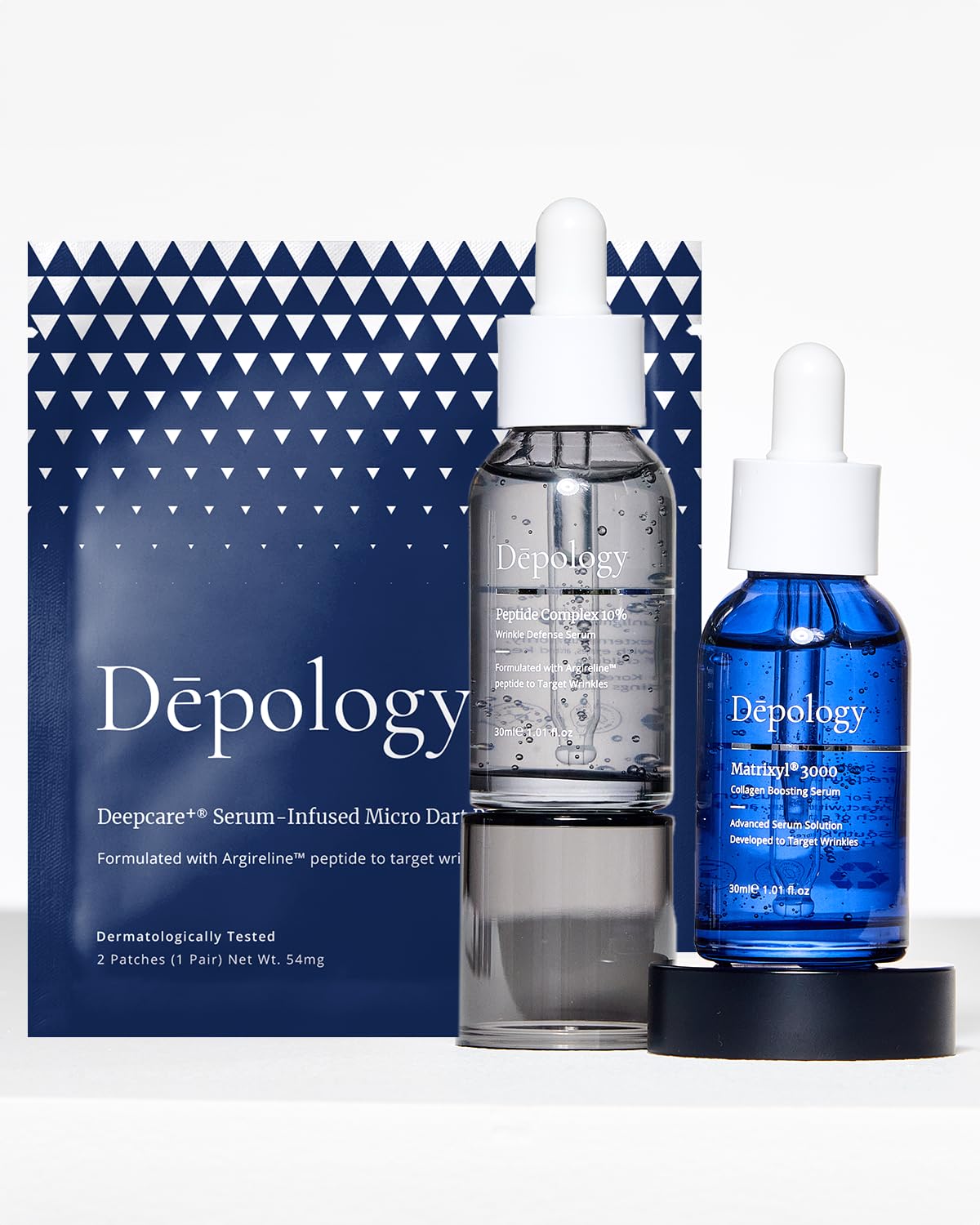 [ Deepcare Serum-Infused Micro Dart Patches ]: Supercharged Micro-Dart Patches that reduce the appearance of fine lines and wrinkles while hydrating the skin. Apply for 2 hours or leave overnight for best results. [ Argireline Peptide Serum ]: A powerful serum formulated with Argireline peptide, clinically proven to improve the appearance of wrinkles and lines and support hydration for smoother, more replenished complexion. [ MATRIXYL 3000 Serum ]: Depology MATRIXYL 3000 Serum boasts a potent blend of ingredients, including the advanced MATRIXYL 3000 peptide serum complex, recognized for its ability to reduce the appearance of fine lines and wrinkles.