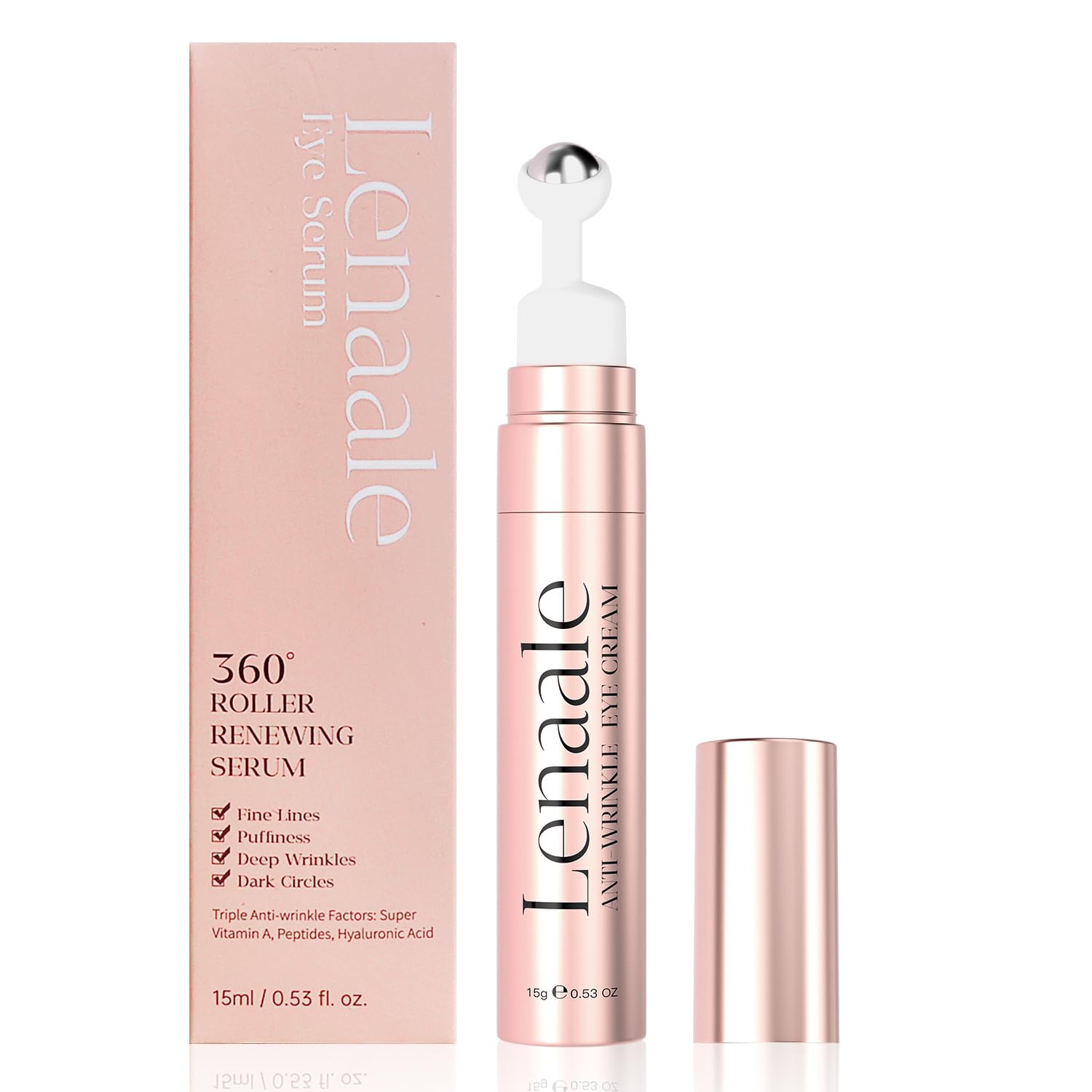 Gentle, Clean Effective Formula – Made with skin-loving ingredients, our serum is suitable for all skin types, including sensitive skin. Free from harsh chemicals, it's dermatologist-tested and cruelty-free. Deep Hydration Fast Absorption – Infused with Hyaluronic Acid Sunflower Seed Oil, this lightweight serum deeply hydrates and nourishes the skin, ensuring a plump, smooth, and radiant under-eye area without feeling greasy. Goodbye Dark Circles Puffy Eyes – Caffeine and Bisabolol work together to visibly brighten dark circles and reduce under-eye bags, leaving your eyes looking refreshed and awake all day long. Triple Anti-Wrinkle Power – Formulated with Super Vitamin A, Peptides, and Hyaluronic Acid, this potent serum boosts collagen production, smooths fine lines, and restores youthful firmness to your delicate eye area. 360 Cooling Roller for Instant Refreshment – Our innovative rollerball applicator delivers a soothing, cooling effect to instantly reduce puffiness, refresh tired eyes, and enhance serum absorption for maximum results.