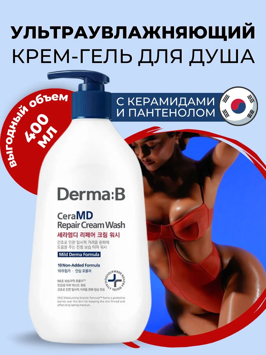 Женский крем гель для душа Derma B CeraMD Creamy Repair Cream Wash интенсивно увлажняет кожу, препятствует сухости и обезвоженности, снимает покраснения и воспаления, укрепляет защитный барьер кожи. Очищающий гель оказывает мягкий и деликатный уход за кожей, который подходит даже при склонности к атопии, экземе или дерматиту. Натуральный гель для душа оснащён удобный дозатором и обладает большим объёмом 400 мл, которого хватит надолго. У геля для тела изысканный аромат мускуса, ванили и жасмина. В основе средства – запатентованная MLE-формула с ламеллярной эмульсией с комплексом керамидов и гиалуроновой кислотой. Защитный барьер кожи воспринимает эмульсию как «родную» и восполняет «бреши» кожного покрова. Керамиды 9STM + 5SPTM повышают иммунитет кожи к вредным факторам окружающей среды, улучшают проникновение других активных компонентов, сохраняют ценную влагу в коже. Натуральные масла ши и виноградной косточки питают и смягчают кожу, выравнивают её цвет, повышают упругость. Не содержит 10 вредных компонентов, таких как минеральное масло, красители, отдушки, триклозан, парабены и др. Действие продукта подтверждено клиническими испытаниями (тест на раздражение = 0%). Уходовая косметика для тела из Кореи.