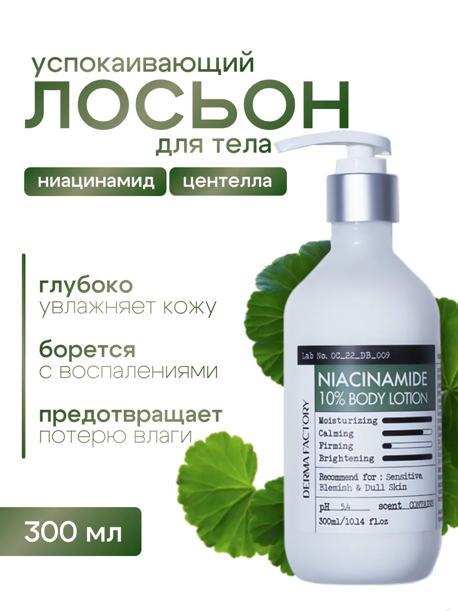| Комплектация | Derma Factory Лосьон для тела ежедневный с 10% ниацинамидом - Niacinamide 10% body lotion, 300мл |