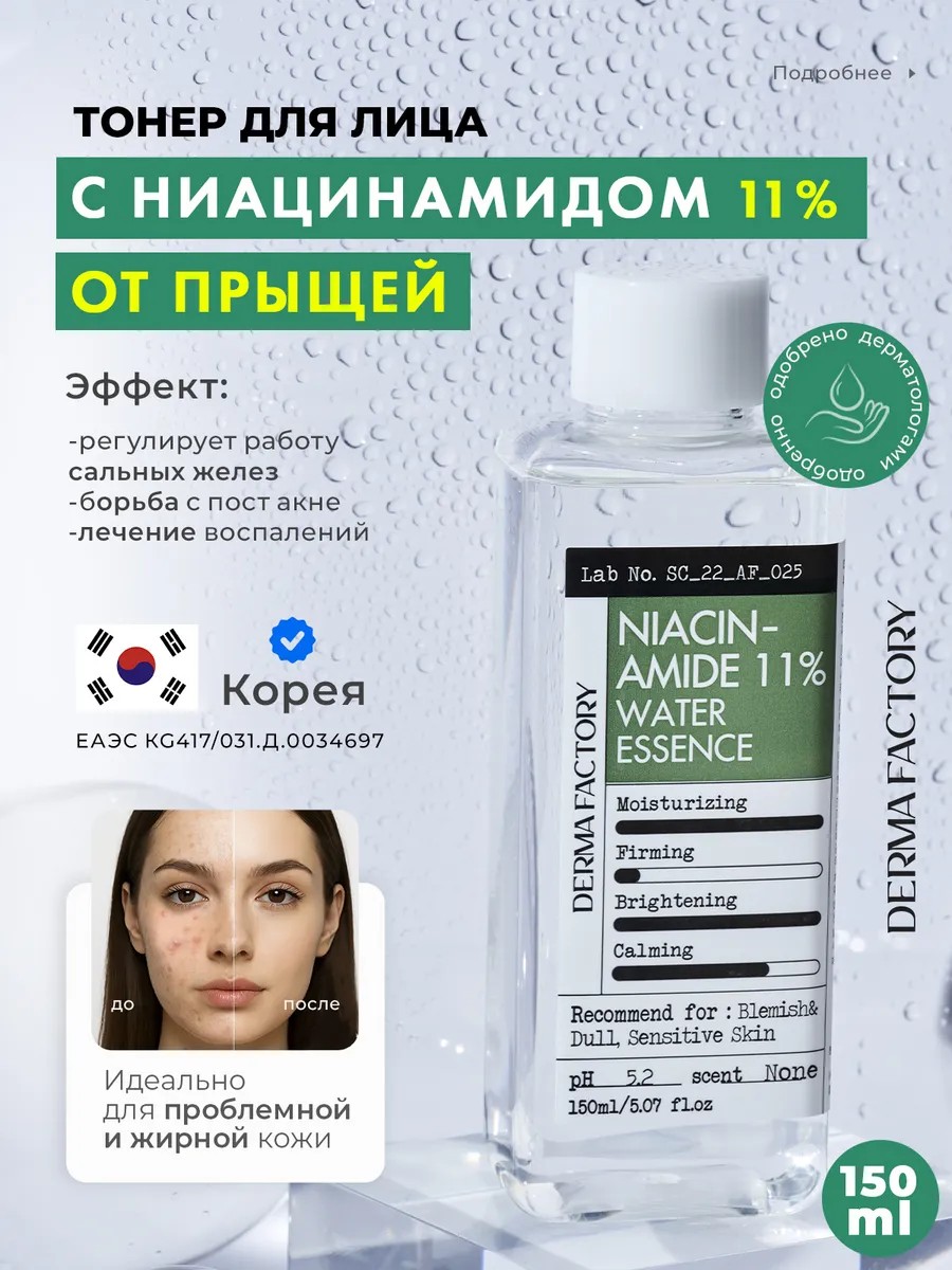 DERMA FACTORY Тонер для лица очищающий от прыщей и акне с ниацинамидом