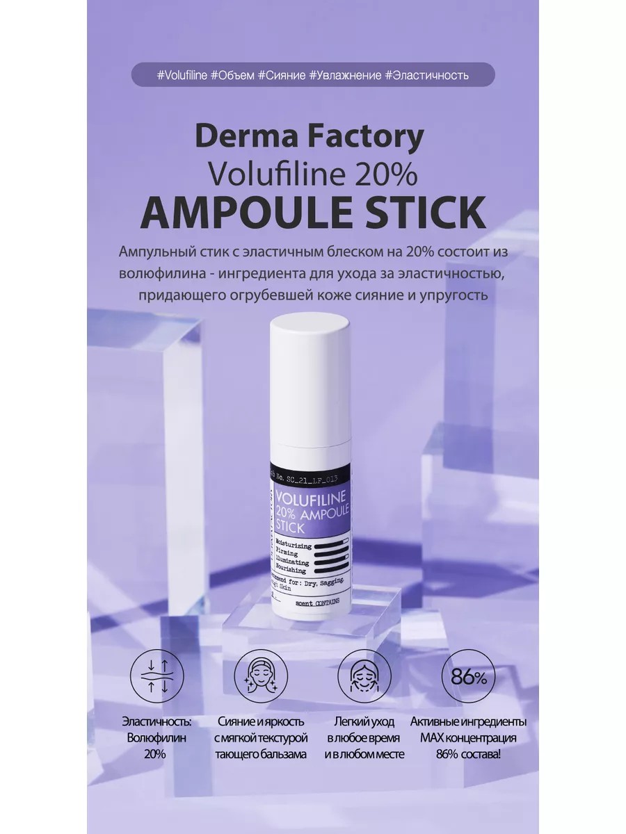 Ампульный стик для эластичности и сияния кожи вокруг глаз на 20% состоящий из волюфилина — ингредиента для ухода за эластичностью, придающий уставшей коже сияние и упругость. Стик-сыворотку так же можно использовать для разглаживания морщин носогубной складки, колец венеры на шее, кожи рук на запястьях, а так же других участках с пониженным тонусом, требующих восстановления эластичности. Ампульный стик с волуфилином от известного корейского бренда Derma Factory (Дерма Фактори) давно известен на рынке в Южной Корее и отлично зарекомендовал себя в разглаживании мимических морщин вокруг глаз и придании эластичности коже лица. Глубокое питательное и увлажняющее действие Волюфилина наполняет кожу и делает ее сияющей жизненной силой. Мягко тающая текстура бальзама персикового цвета с первого нанесения обеспечивает глубокое питание и мгновенно наполняет кожу жизненной силой, сиянием и ощущением увлажнения. Не оставляет липкости и духоты даже после многократного нанесения. Рекомендации: Можно наносить на сухую кожу тела для интенсивного увлажнения и ухода за эластичностью. До и после макияжа вы можете нанести его на нос, лоб и щеки, чтобы создать мерцающее сияние. Способ применения: На последнем этапе ухода аккуратно нанесите на кожу. Сосредоточьтесь на областях, эластичность которых вызывает беспокойство, таких как шея, область вокруг глаз, носогубные складки, лоб и подбородок.