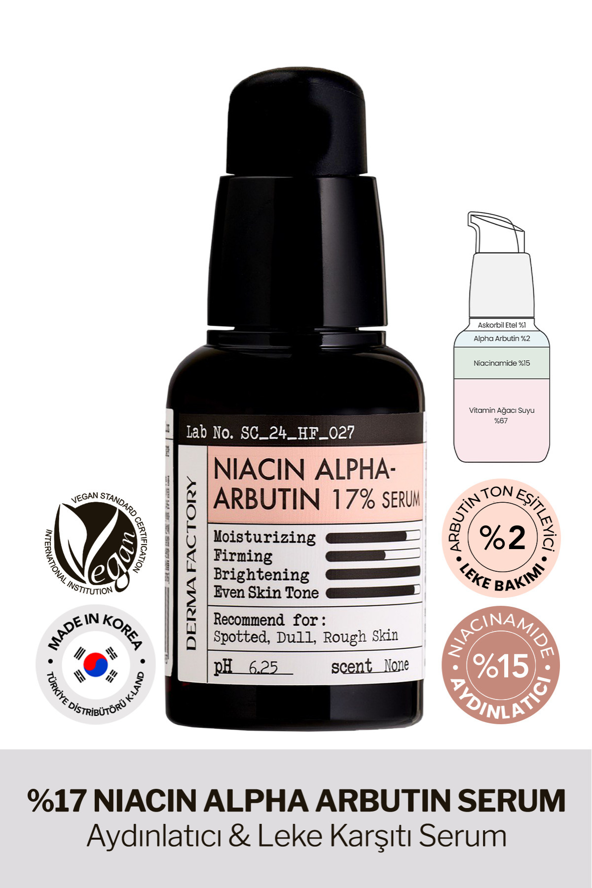 • Güney Koreli dermatologlar tarafindan gelistirilen DermaFactory'den Niacin Alpha Arbutin 17 Serum