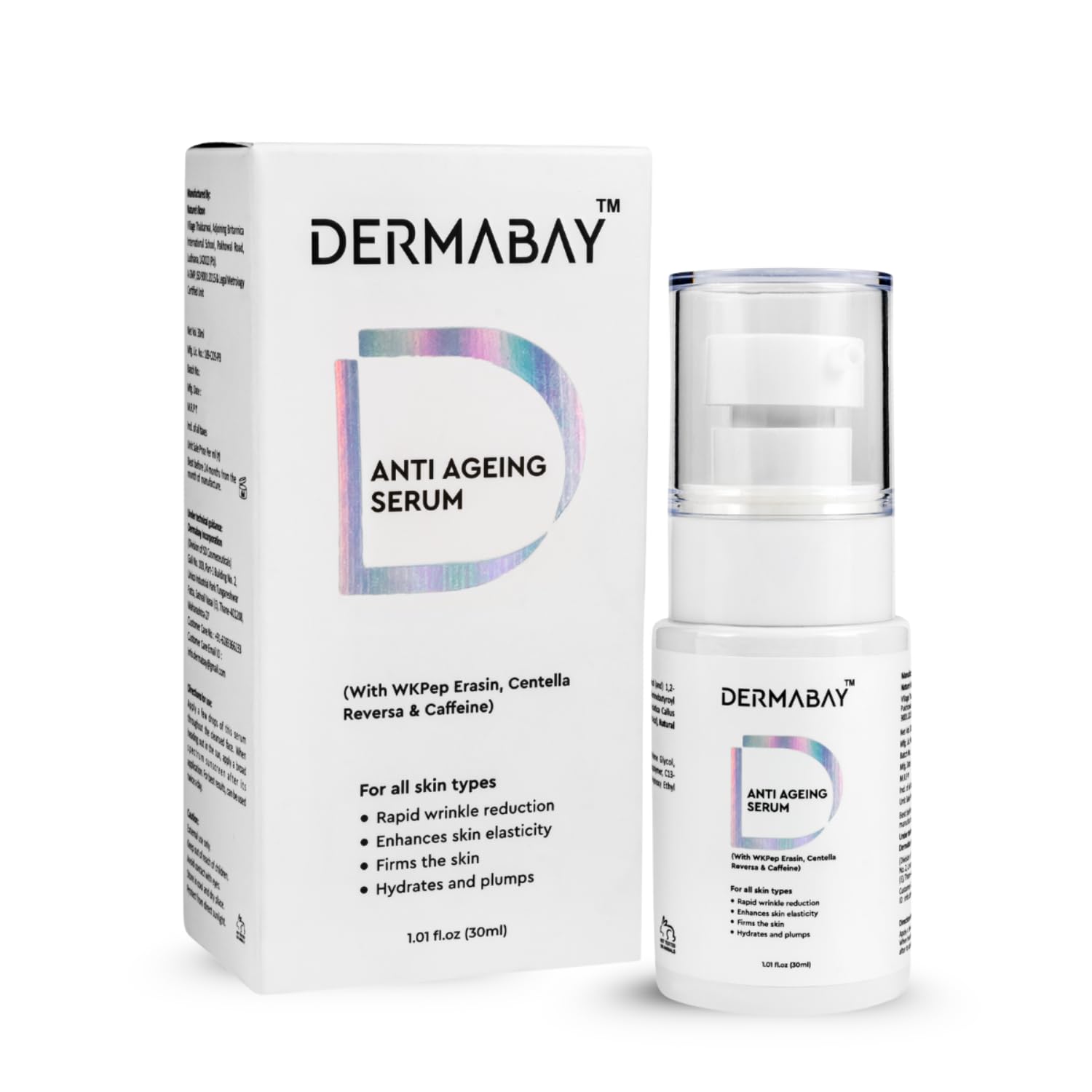 Turn Back Time: Dermabay Anti-Ageing Serum is your key to reversing the clock, expertly crafted to diminish the signs of ageing and restore youthful radiance. Say goodbye to fine lines, wrinkles, and dullness as you unveil a more youthful complexion.Revitalize Your Skin: Experience the transformative power of advanced skincare with our formula that revitalizes, rejuvenates, and nourishes your skin from within. Let your skin glow with renewed vitality and radiance, thanks to our potent blend of age-defying ingredients.Suitable for All Skin Types: Formulated with care, our serum is suitable for all skin types, ensuring that everyone can enjoy the benefits of age-defying skincare. Whether you have dry, oily, sensitive, or combination skin, Dermabay Anti-Ageing Serum is your trusted ally in the fight against aging.Powerful Ingredients: Packed with potent and natural ingredients, our serum is your go-to solution for achieving a smoother, firmer, and more radiant complexion. From WKPep Er to Centella Reversa and Caffeine, each ingredient works in harmony to deliver visible results you'll love.Fights Fine Lines and Wrinkles: Combat the visible signs of aging with ease as our serum targets fine lines and wrinkles, promoting a more youthful and vibrant look. With regular use, you'll notice a significant reduction in the appearance of age-related concerns, leaving you with smoother and more supple skin.Fights Fine Lines and Wrinkles: Combat the visible signs of aging with ease as our serum targets fine lines and wrinkles, promoting a more youthful and vibrant look. With regular use, you'll notice a significant reduction in the appearance of age-related concerns, leaving you with smoother and more supple skin. Powerful Ingredients: Packed with potent and natural ingredients, our serum is your go-to solution for achieving a smoother, firmer, and more radiant complexion. From WKPep Er to Centella Reversa and Caffeine, each ingredient works in harmony to deliver visible results you'll love. Suitable for All Skin Types: Formulated with care, our serum is suitable for all skin types, ensuring that everyone can enjoy the benefits of age-defying skincare. Whether you have dry, oily, sensitive, or combination skin, Dermabay Anti-Ageing Serum is your trusted ally in the fight against aging. Revitalize Your Skin: Experience the transformative power of advanced skincare with our formula that revitalizes, rejuvenates, and nourishes your skin from within. Let your skin glow with renewed vitality and radiance, thanks to our potent blend of age-defying ingredients. Turn Back Time: Dermabay Anti-Ageing Serum is your key to reversing the clock, expertly crafted to diminish the signs of ageing and restore youthful radiance. Say goodbye to fine lines, wrinkles, and dullness as you unveil a more youthful complexion.