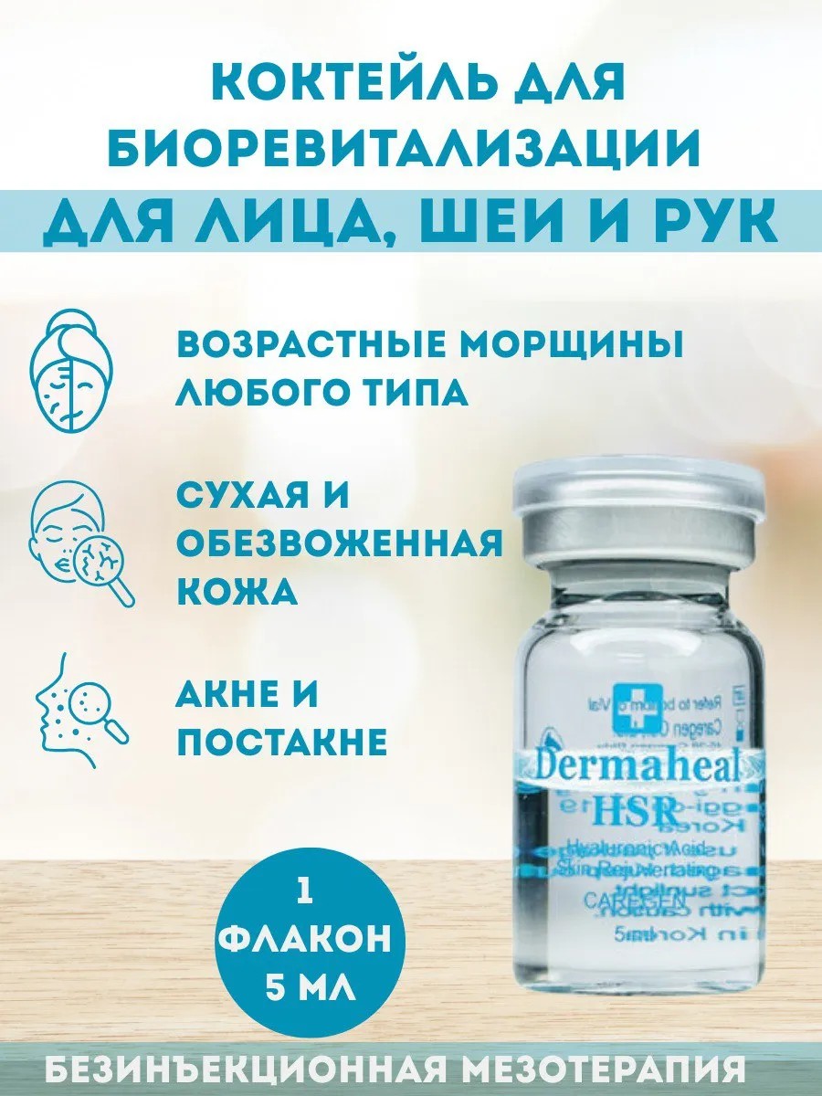Dermaheal HSR является препаратом для мезотерапии против морщин, состоящим из 58 активных ингредиентов, включающих комплекс биомиметических пептидов, гиалуроновую кислоту, мульти-витамины и аминокислоты.