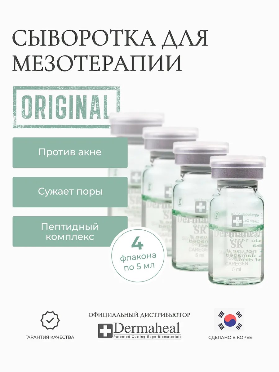 The SR mesotherapy rejuvenating serum (Korea) is designed for professional skin care and combats wrinkles, acne, and enlarged pores. This mesotherapy product stimulates the synthesis of collagen, elastin, and hyaluronic acid. What makes this product unique is its composition: 5 biomimetic peptides, 13 vitamins, 24 amino acids, 5 minerals, 4 enzymes, 4 nucleic acids, and 2 antioxidants. All these components are aimed at slowing down the aging process, as well as comprehensively renewing and improving appearance. Another unique feature of this mesotherapy cocktail is its versatility – it is effective for the face, hands, neck, body, and eye area. This nourishing serum is suitable for normal, sensitive, and thin skin. One of the functions of the mesotherapy cocktail is regulating the water balance, making it effective for dry, oily, and combination skin, moisturizing it. This solution is highly valued by cosmetology professionals not only for its rich formula but also for its excellent results. The serum is effective against breakouts, acne, blackheads, uneven skin tone, and fine lines around the eyes and lips. This anti-aging serum tightens pores and evens out skin tone, leaving skin smooth, firm, and radiant. The high quality of Dermaheal Korean facial cosmetics is recognized by the Cosmetics, Fragrance, and Cosmetics Association (CTFA), and the products are patented in many countries. Once opened, refrigerate for no more than 14 days.