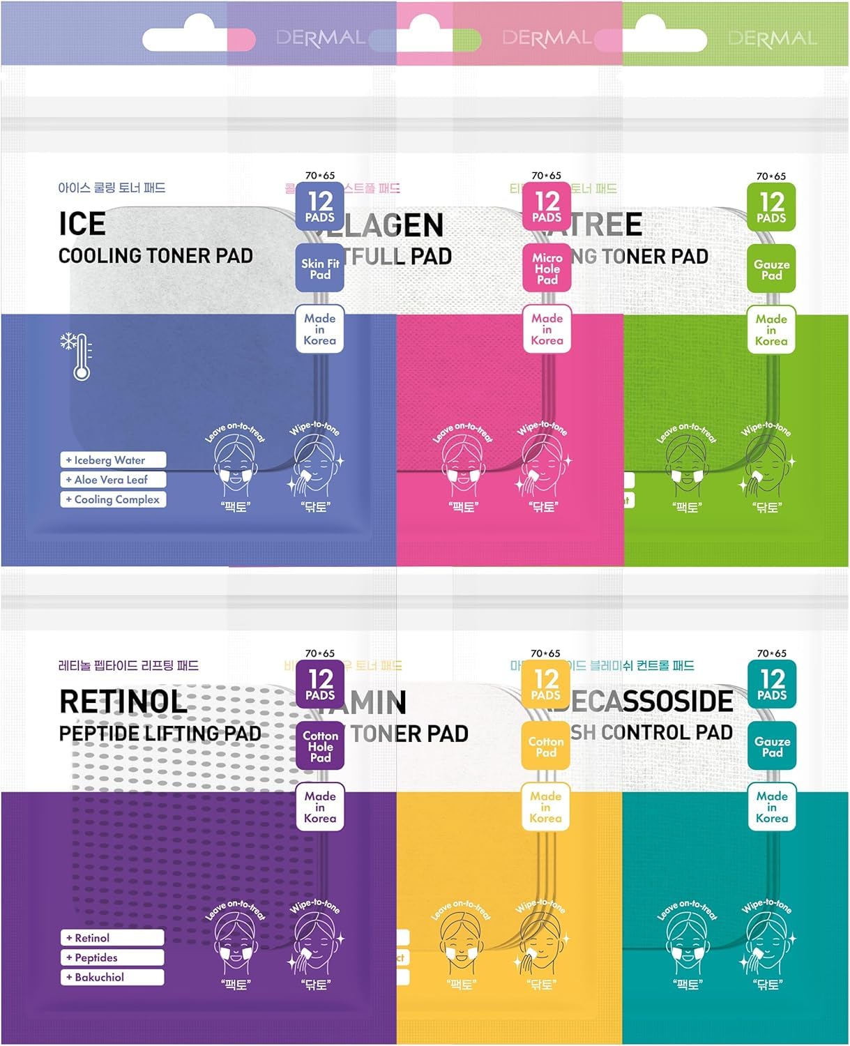 DERMAL 6 Types Toner Pad Trial Kit Portable Travel Combo Set - Ice Cooling Collagen Retinol Madecassoside Tea Tree Vitamin Korean Face Toner Pads 12 Pads x 6 Pack