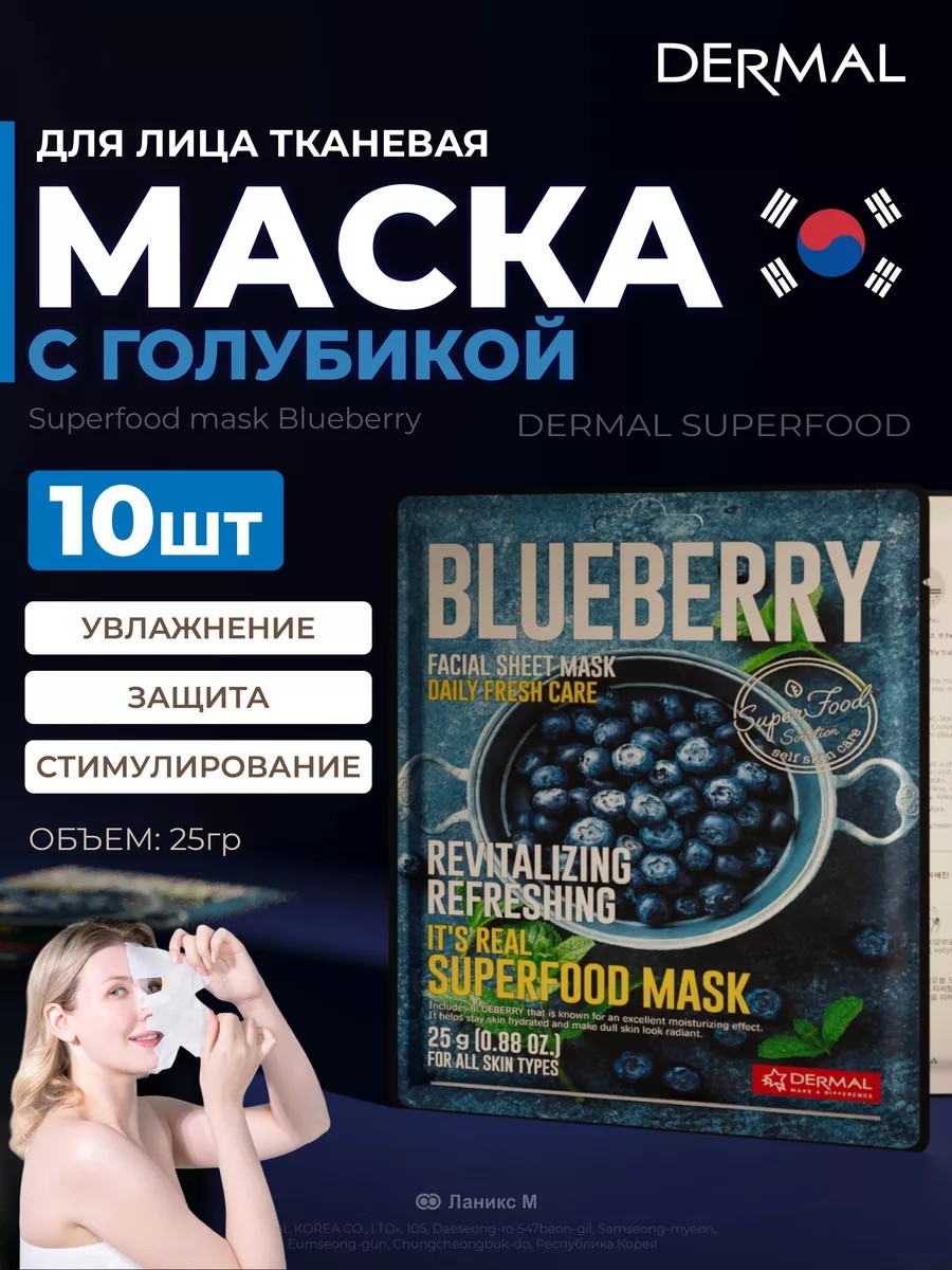 Dermal Маски для лица с голубикой Superfood Набор 10шт