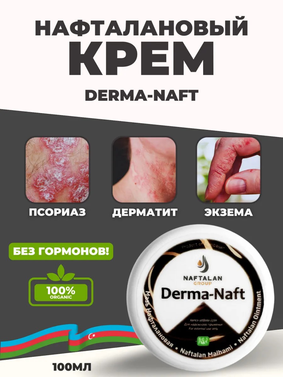 Крем от псориаза, атопического дерматита, экземы и нейродермита DERMA-NAFT представляет собой универсальное косметическое средство, предназначенное для восстановления, заживления и противовоспалительного действия. Этот крем содержит рафинированный нафталан,вазелин и парафин, что делает его подходящим для использования на всех типах кожи, включая ноги, руки и тело. Благодаря своему составу, мазь от псориаза, дерматита БЕЗ ГОРМОНОВ, помогает уменьшить воспаление и восстановить здоровье поврежденной кожи, обеспечивая глубокое увлажнение и защиту. DERMA-NAFT – это эффективное решение для тех, кто страдает от различных кожных заболеваний, желающих восстановить естественную красоту и здоровье своей кожи.