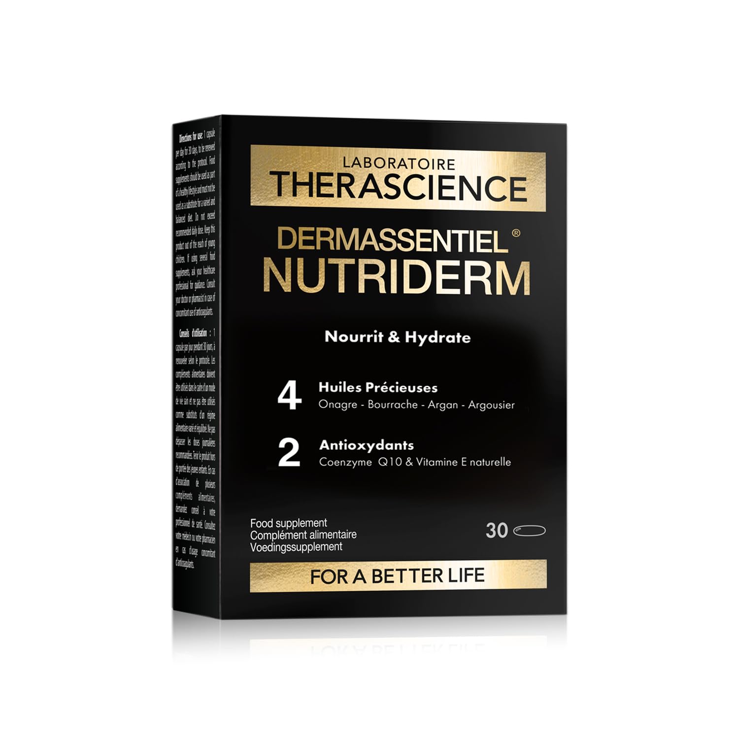 QUALITY AND TRANSPARENCY Nutriderm is made in Germany and carries the Clean Label, guaranteeing a product free of colorings, preservatives, nanoparticles, gluten, and lactose. The THERASCIENCE Laboratory has specialized for over 25 years in the research and manufacture of food supplements, herbal remedies, and dietary products. More than 10,000 healthcare professionals worldwide recommend its products to their patients. CLINICALLY PROVEN Nutriderm provides you with optimal doses of plant oils that have demonstrated, through clinical studies, their effectiveness in hydrating, firming, and improving skin elasticity. CONCENTRATED ACTIVE INGREDIENTS Our four plant oils are naturally rich in essential fatty acids, vital for skin regeneration. Our formula provides you with 6 mg of omega-3, 542 mg of omega-6, including 87 mg of ?-linolenic acid (GLA), 82 mg of omega-7 and 225 mg of omega-9. SUPPLESSNESS AND BEAUTY Our formula combines 300 mg of lipid-replenishing argan oil and 200 mg of sea buckthorn oil to enhance skin elasticity, as well as 300 mg of evening primrose oil and 300 mg of borage oil for the health and beauty of your skin. ? ULTRA-NOURISHING A highly concentrated synergistic combination of 4 precious oils: argan, borage, evening primrose, sea buckthorn, and 2 antioxidants: coenzyme Q10 and vitamin E, to combat oxidative stress responsible for skin aging, this is the ideal ultra-nourishing and moisturizing formula for the skin.