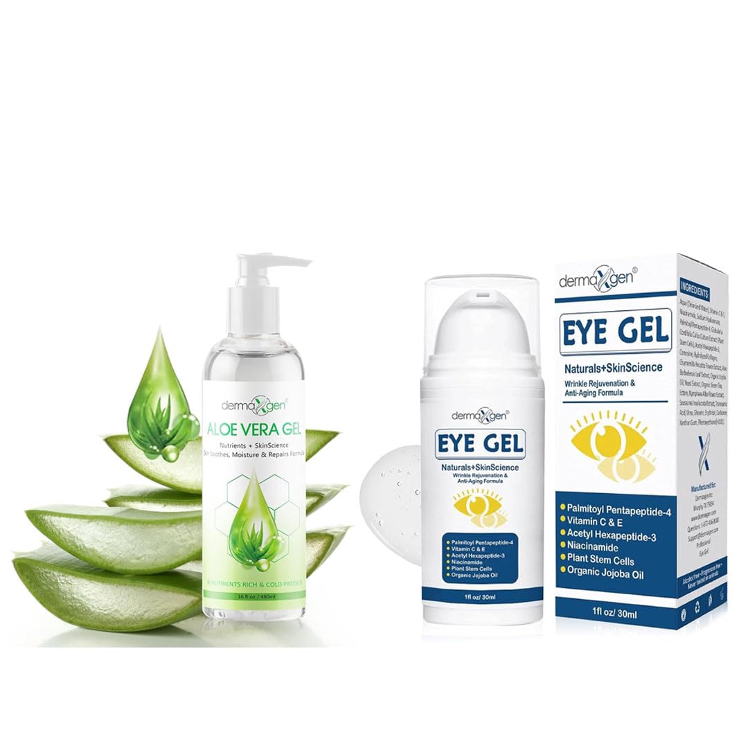 DERMAXGEN Aloe Vera Gel with Vitamins C & E (16 FL OZ) + Peptide Eye Gel with Plant Stem Cells & Matrixyl 3000 Hydrating Face & Eye Care Set for Smoother-Looking Refreshed Skin All Skin Types