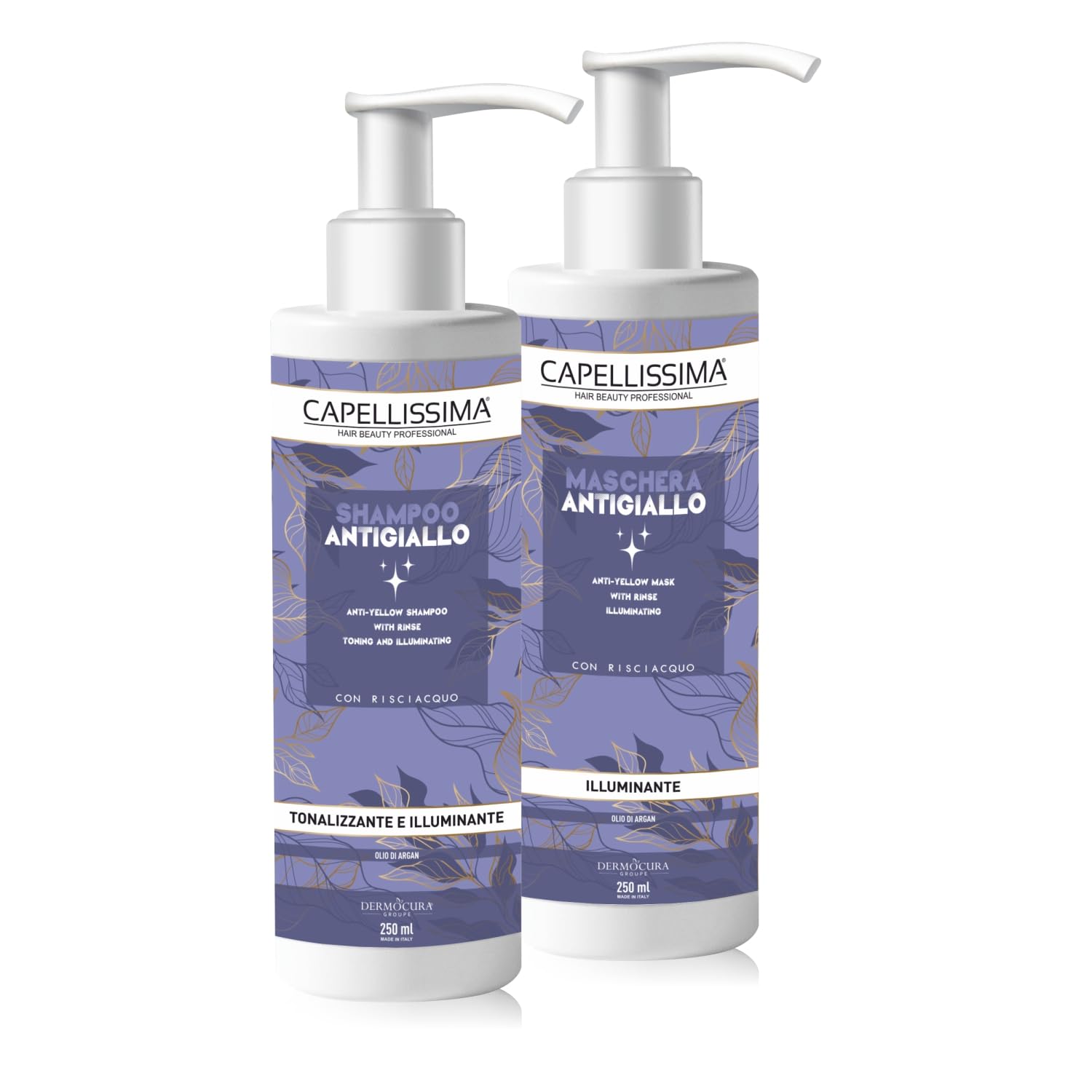 Professional anti-yellow hair set: Get radiant blonde hair without unwanted reflections with our professional yellowing set. Carefully formulated in Italian laboratories, this set offers a complete solution to keep your hair radiant and natural. Removal of yellow reflexes: Our kit contains a shampoo and an anti-yellow mask designed to effectively neutralize unwanted yellow tones. Thanks to the improved effect, your hair becomes free of yellow and golden reflections and gives it a radiant and fresh look. Deeply nourishing and restorative nourishment: enriched with valuable argan oil, our kit provides intensive nutrients for your hair. This natural ingredient penetrates deep into the hair fiber, repairs damage caused by external influences and improves the elasticity and strength of the hair. ? Long-lasting results and enchanting shine: With regular use of our shampoo and our anti-yellow mask, your hair will retain its cool and radiant shine over time. The advanced formula works progressively and protects the hair against the harmful effects of sun, wind and weather. Excellent Italian Quality: Made with pride in Italian laboratories, our kit meets the highest standards of quality and craftsmanship. We use only high-quality, carefully selected ingredients to ensure professional and authentic Italian results. Advanced protection and deep care: Our mild but effective formula not only protects the hair against weather and heat, but also deeply nourishes it. Your hair becomes soft, silky and shiny and ready to catch admiring glances wherever you go. Choose the professional hair yellowing set from Capellissima for light, perfectly bouncy blond hair, which provides exceptional care and visible results from the first applications. Step into the world of authentic Italian beauty and turn your hair into a source of admiration. INGREDIENTS Complete set of anti-yellow shampoo, hair mask against yellow sweat, water, sodium laurth sulfate, cocamidopropyl betaina, cocamide dea, propylene glycol, Moringa Officinals, Argania Spinosa, Polyquternium10, Polyquaternium 7, Acid Violen. T 3, citrier C acid, fragance, disodium EDTA, METHYLCLOROISOTHIAZOLINONE, METHYLISOTHIAZOLINONE, IMIDAZOLIDINYL UREA INSTRUCTIONS FOR USE Use an appropriate amount of product and distribute it evenly throughout the hair SAFETY WARNING External application: this anti-yellow shampoo and anti-yellow mask is intended for external use on the hair only. Avoid contact with the eyes and the area around the eyes. In case of accidental contact, rinse thoroughly with water. See moreDeep care and protection: Give your hair deep care and lasting protection with our anti-yellow mask. The mild but effective formula deeply nourishes the hair and repairs damage caused by external influences. In addition, its protective effect protects the hair against the harmful effects of heat and weather and keeps it soft, silky and shiny. Ideal for frequent use as part of your hair care routine, our mask provides visible and lasting results. Excellent Italian product: made with pride in Italian laboratories respecting the highest standards of quality and craftsmanship. We use only high-quality, carefully selected ingredients to ensure professional and authentic Italian results. Choose authentic Italian beauty for your hair and enjoy extraordinary care that turns your hair into a source of admiration. Our anti-yellow mask represents the best of Italian craftsmanship in hair care. Long-lasting results and durability: Our anti-yellowing mask works progressively and protects the hair against the harmful effects of sun, weather and wind. The results are visible from the first use and are maintained over time, providing a glow and vitality that does not go unnoticed. Your hair will retain its cool and radiant shine over time, maintaining a fresh and radiant look. Deep nourishment: enriched with argan oil, known for its nourishing and regenerating properties. Our anti-yellowing kit penetrates deep into the hair, repairs damage caused by external influences and improves elasticity and durability. In addition, its invigorating effect gives the hair a lighter and more vibrant color and eliminates unsightly yellow and gold reflections. The rich care formula leaves the hair looking soft, silky and manageable. ? Powerful anti-yellow effect: eliminates unwanted yellow reflections on blond, white, gray or bleached hair. Make your hair shiny and fresh with our anti-yellow kit that includes shampoo 250 ml and anti-yellow mask 250 ml. This powerful formula is designed to neutralize yellow and gold tones and leave your hair radiant and natural.Capellissima Professionele anti-gelset, effectieve anti-gele shampoo 250 ml en anti-geel masker 250 ml, verwijdert geel en herstelt een natuurlijk effect voor wit of behandeld haar Professionele anti-gele haarset: krijg stralend blond haar zonder ongewenste reflecties met onze professionele vergelingsset. Zorgvuldig geformuleerd in Italiaanse laboratoria, biedt deze set een complete oplossing om je haar stralend en natuurlijk te houden. Verwijdering van gele reflexen: onze kit bevat een shampoo en een anti-geel masker dat is ontwikkeld om ongewenste gele tinten effectief te neutraliseren. Dankzij het verbeterde effect wordt je haar vrij van gele en gouden reflecties en geeft het een stralende en frisse uitstraling. Diepteverzorgende en herstellende voeding: verrijkt met waardevolle arganolie biedt onze kit intensieve voedingsstoffen voor je haar. Dit natuurlijke ingrediënt dringt diep door in de haarvezel, herstelt schade door invloeden van buitenaf en verbetert de elasticiteit en stevigheid van het haar. ? Duurzame resultaten en betoverende glans: bij regelmatig gebruik van onze shampoo en ons anti-geel masker behoudt je haar na verloop van tijd zijn koele en stralende glans. De geavanceerde formule werkt progressief en beschermt het haar tegen de schadelijke effecten van zon, wind en weer. Uitstekende Italiaanse kwaliteit: gemaakt met 