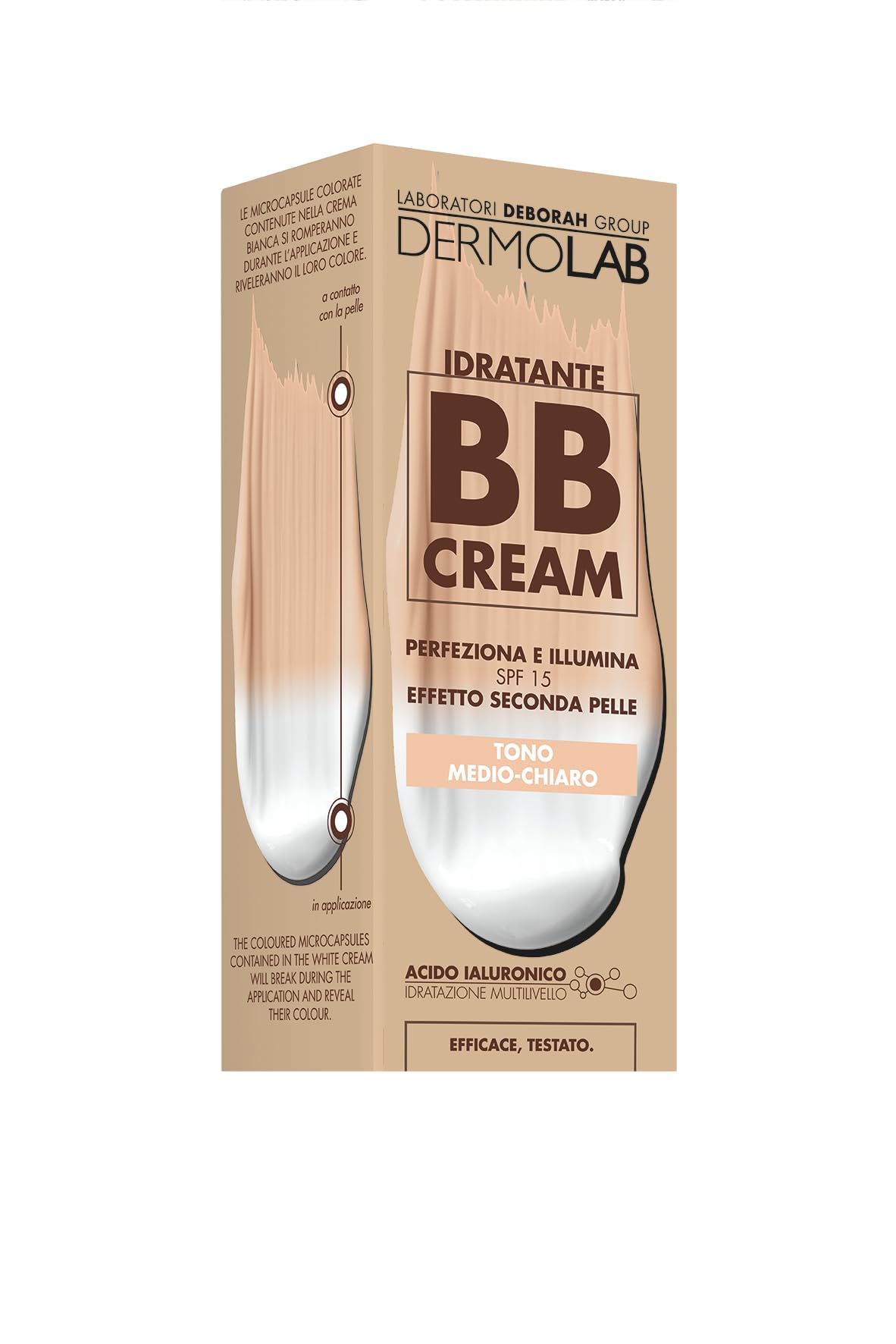 From Deborah's constant research to develop cutting-edge skincare products, the Dermolab line was born, designed and researched to combat the signs of aging effectively and safely. All formulations utilize a pool of hyaluronic acids with varying molecular weights that work from the stratum corneum to the deepest layers of the dermis, respecting the skin's natural balance. This moisturizing BB Cream, composed of microencapsulated pigments that reveal color upon application, blends seamlessly with the skin tone, adding color and perfecting the complexion. SAFETY WARNING For external use only. Avoid contact with eyes.Contents: 1 x Dermolab – BB Moisturizing Cream, Medium Light Shade, 50 ml. Application: Dispense a small amount and spread with your fingers from the center of the face outwards. Then, blend more precisely with a soft, rounded brush. Effect: Provides a natural radiance and protects the skin from the sun's rays thanks to SPF 15. Formula: Enriched with a pool of hyaluronic acids of varying molecular weights for multi-level hydration and Hydracomplex, which helps strengthen the skin barrier and counteracts the signs of aging caused by exposure to blue light. Product: A tinted moisturizer that evens out, hydrates, brightens, and protects the skin in one step.Dermolab - BB Crème hydratante, ton moyen clair, perfectionne et éclairage, effet seconde peau, 50 mlDESCRIPTION DU PRODUIT DESCRIPTION DU PRODUIT De la recherche constante de Deborah pour développer des produits de pointe dans le skincare naît la ligne Dermolab, conçue et étudiée pour lutter contre les signes du temps de manière efficace et sûre. Toutes les formulations utilisent un pool d'acides hyaluroniques à différents poids moléculaires qui travaillent à partir de la couche cornée jusqu'à atteindre les couches les plus profondes du derme, dans le respect de l'équilibre cutané naturel. BB Crème hydratante, composée de pigments microencapsulés, qui révèlent la couleur une fois appliqués, se fond parfaitement avec le teint de la peau en la colorant et en perfectionnant le teint AVERTISSEMENT DE SÉCURITÉ Usage extérieur uniquement. Évitez tout contact avec les yeux.Contenu : 1 x Dermolab – BB crème hydratante, ton moyen clair, 50 ml. Application : relâchez une petite quantité et étalez avec les doigts du centre du visage vers l'extérieur. Après cela, estomper avec plus de précision avec un pinceau doux et arrondi. Effet : donne une luminosité naturelle et protège la peau des rayons du soleil grâce au SPF 15. Formule : enrichie avec un pool d'acides hyaluroniques à différents poids moléculaires pour une hydratation à plusieurs niveaux et Hydracomplex qui contribue à renforcer la barrière cutanée et contraste le vieillissement cutané causé par l'exposition de la peau à la lumière bleue. Produit : crème hydratante colorée qui uniforme, hydrate, éclaire et protège la peau en un seul geste.