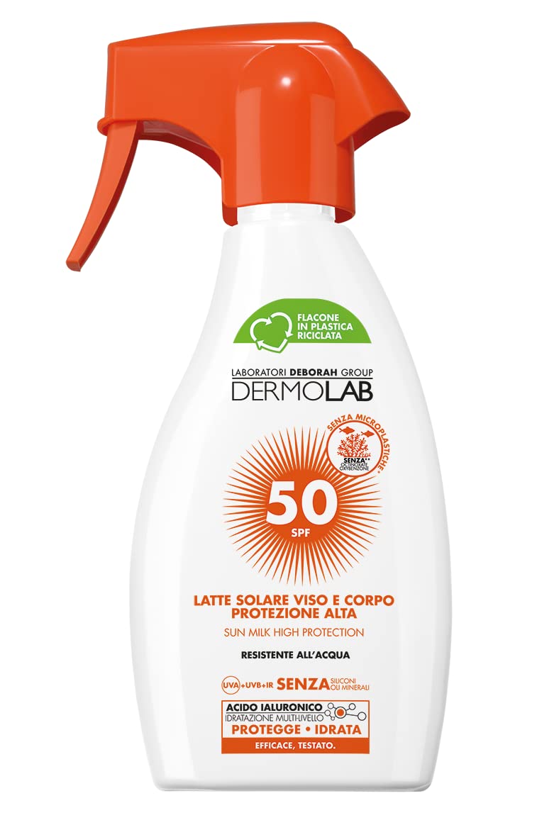 Dermolab - Lait solaire spray visage et corps, protection haute SPF 50, pour peaux claires et délicates, contraste vieillissement cutané et rayons UVA, résistant à l'eau, testé dermatologiquement, 250