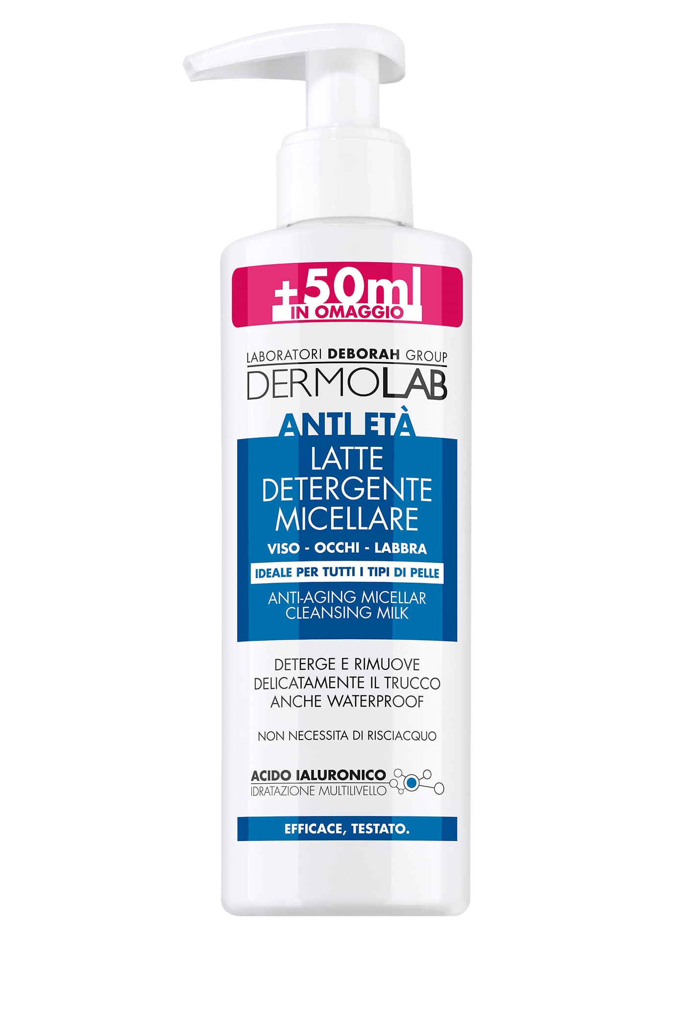 Gently removes makeup and cleanses deeply, leaving the skin polished and elastic, guaranteeing a perfect balance between cleansing and respect for your skin. Combines the effectiveness of milk with the delicacy of micellar water. Contains a pool of multiLIVELLO hyaluronic acids, including a low molecular weight one that penetrates to the deepest layers of the epidermis, minimizing the visibility of wrinkles. Ideal for all skin types, even the driest. Dermatologically and obscurable testedDermatologically tested. With a pool of hyaluronic acids for multi-level hydration. Gently removes makeup and cleanses deeply. Enlève délicatement le maquillage et détergent en profondeur en laissant la peau polie et élastique garantissant un parfait équilibre entre nettoyage et respect pour votre peau. Associe l'efficacité du lait à la délicatesse de l'eau micellaire. Contient un pool d'acides hyaluroniques multiLIVELLO dont un à faible poids moléculaire qui pénètre jusqu'aux couches les plus profondes de l'épiderme en minimisant la visibilité des rides. Idéal pour tous les types de peau, même les plus sèches. Dermatolgiquement et obscurcissable testéeTesté dermatologiquement. Avec un pool d'acides hyaluroniques pour une hydratation multi-niveau. Enlève délicatement le maquillage et nettoie en profondeur.