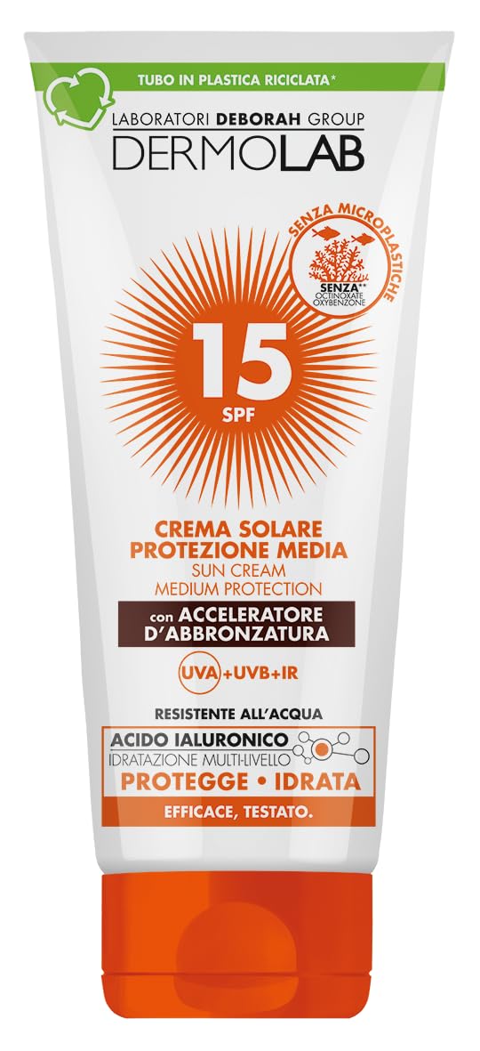 Dermolab - Sun cream for face and body medium protection SPF 15 with tanning accelerator contrasts skin aging and UVA rays water resistant tested