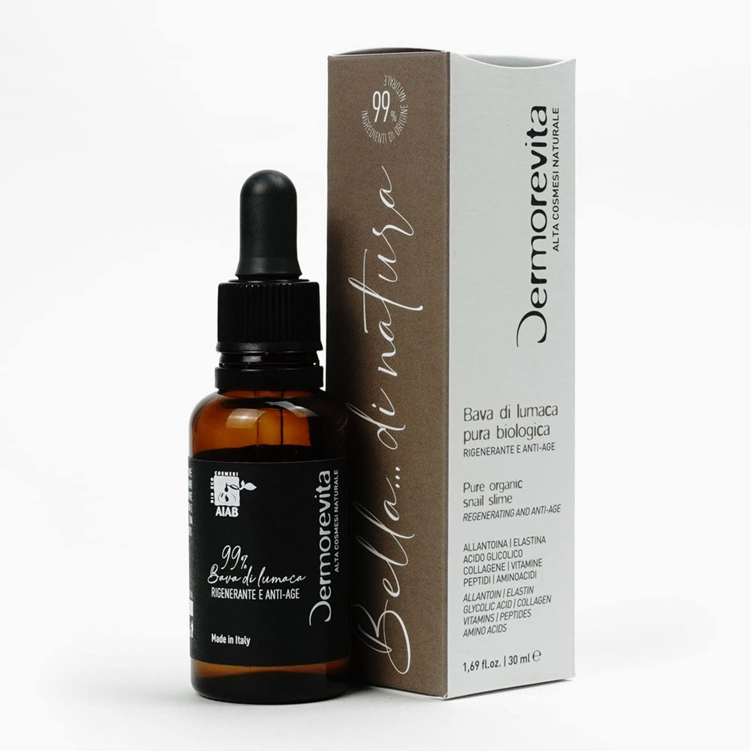 Dermorevita Organic snail glue 99 pure made in Italy certified organic antiaging regenerating fights spots acne wrinkles scars 30 ml
