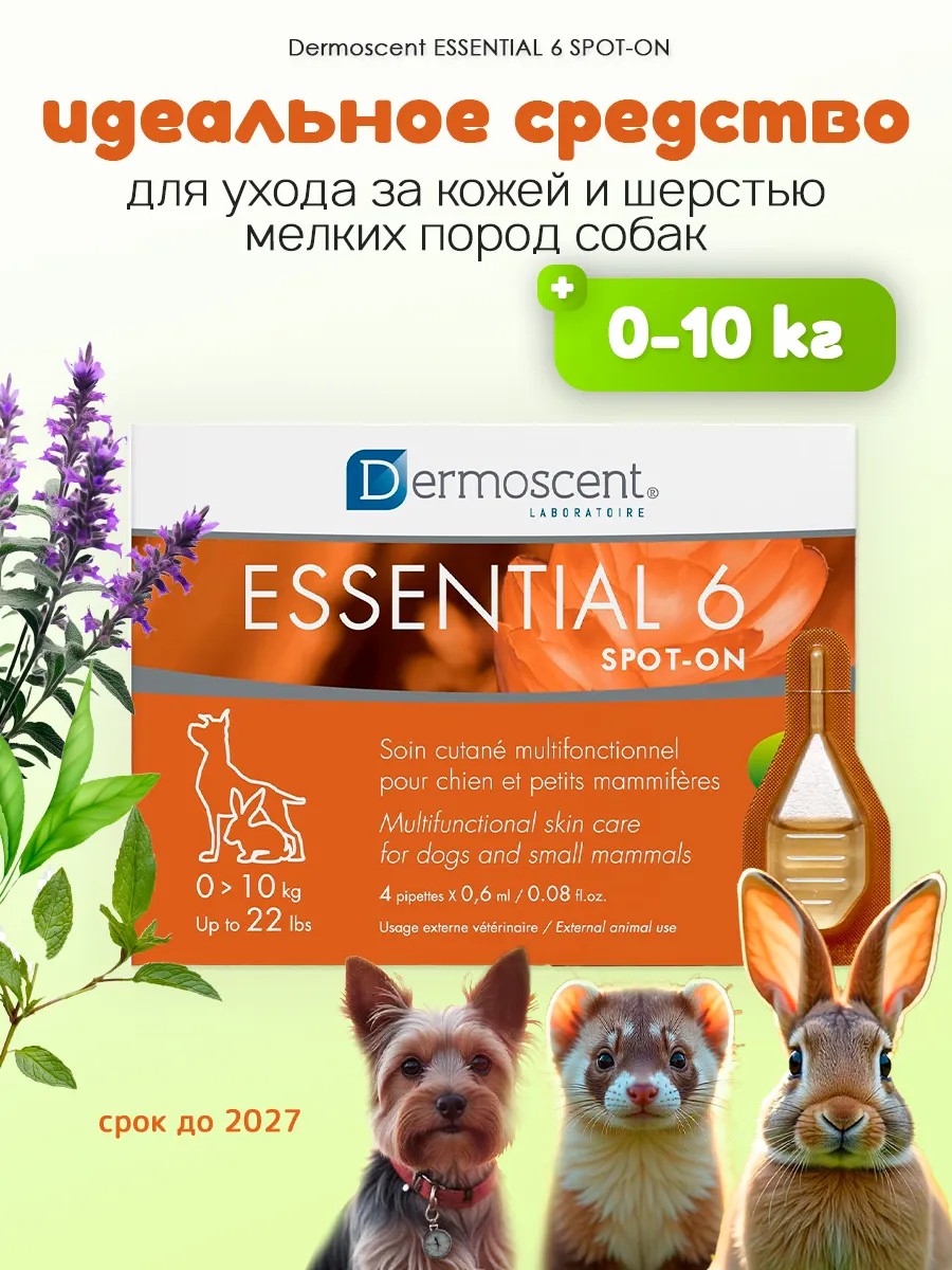 Dermoscent Essential 6 0-10 кг — это комплексное средство для ухода за кожей и шерстью собак и мелких млекопитающих (кроликов, хорьков, морских свинок, хомяков, крыс, мышей) весом до 10 кг. Оно разработано для восстановления и поддержания здоровья кожи, уменьшения запаха, а также для улучшения состояния шерсти. Препарат представляет собой капли для точечного нанесения, содержащие натуральные активные компоненты.
