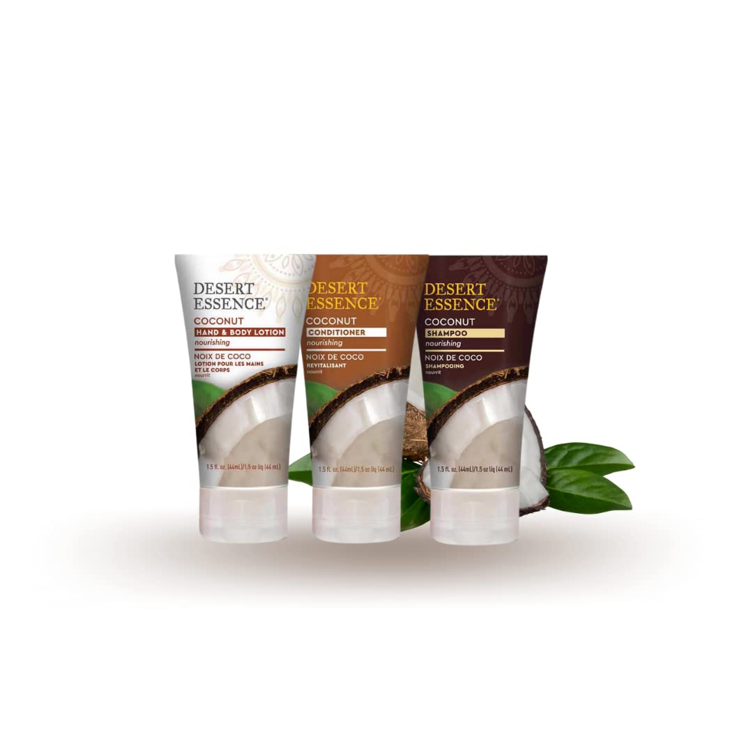 Shampoo and Hair Conditioner: Deeply hydrate and condition dry hair with Desert Essence nourishing coconut shampoo and conditioner. Organic coconut oil provides intense hydration, softens frizzy hair and restores the hair's natural shine. Organic shea butter, hemp, olive and sunflower oil provide deep hydration without leaving a greasy film. For shiny, stronger and healthier hair Hand Body Lotion: Nourish your skin and delight your senses with Desert Essence's Coconut Hand and Body Lotion. Organic coconut and jojoba oils help protect the skin's natural moisture barrier, while organic hibiscus and passion fruit extract leave your skin feeling soft and sensual. INSTRUCTIONS FOR USE Apply shampoo to wet hair, lather, rinse. Apply conditioner to damp hair, let it sit for a few minutes and then rinse. SAFETY WARNING Avoid contact with the eyes. In case of contact, rinse immediately. For external use only. See moreNot tested on animals and biodegradable. FREE FROM: Parabens, phthalates, artificial colors, silicones, EDTA, propylene glycol, mineral oil, petrolatum, paraffin and phosphates. 100 vegan, wheat and gluten free. Nourishing. Travel size. Ideal for toiletries.Desert Essence - Kokosnoot Shampoos, Haarconditioners en Hand Bodylotions - Reisformaat - Triopakket - 3 x 44mL Shampoo en Haarconditioner: Diep hydrateren en verzorgen droog haar met Desert Essence voedende kokosnoot shampoo en conditioner. Biologische kokosolie zorgt voor intense hydratatie, verzacht pluizig haar en herstelt de natuurlijke glans van het haar. Biologische sheaboter, hennep-, olijf- en zonnebloemolie zorgen voor een diepe hydratatie zonder een vettig laagje achter te laten. Voor glanzend, sterker en gezonder haar Hand Bodylotion: Voed je huid en verblijd je zintuigen met Desert Essence's Coconut Hand en Body Lotion. Biologische kokosnoot- en jojobaolie helpen de natuurlijke vochtbarrière van de huid te beschermen, terwijl biologische hibiscus en passievruchtextract uw huid zacht en sensueel laten aanvoelen. GEBRUIKSAANWIJZING Breng shampoo aan op nat haar, schuimen, spoelen. Breng conditioner aan op vochtig haar, laat het een paar minuten intrekken en spoel het daarna af. VEILIGHEIDSWAARSCHUWING Vermijd contact met de ogen. In geval van contact, onmiddellijk spoelen. Alleen voor uitwendig gebruik. Meer bekijkenNiet getest op dieren en biologisch afbreekbaar. VRIJ VAN: Parabenen, ftalaten, kunstmatige kleurstoffen, siliconen, EDTA, propyleenglycol, minerale olie, petrolatum, paraffine en fosfaten. 100 veganistisch, tarwe- en glutenvrij. Voedend. Reisformaat. Ideaal voor toiletspullen.