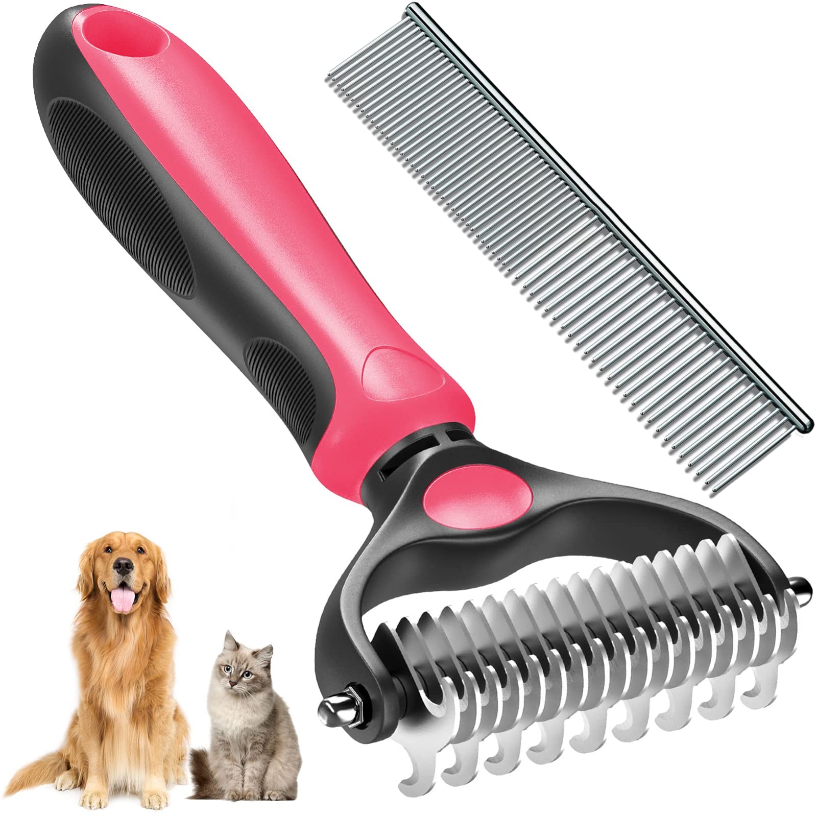 Deshedding Brush for Dog and Cat Pet Grooming Rake and Brushes for Small Medium & Large Dogs 17+9 Double Sided Deshedding Tool with free Dog Comb(pink)