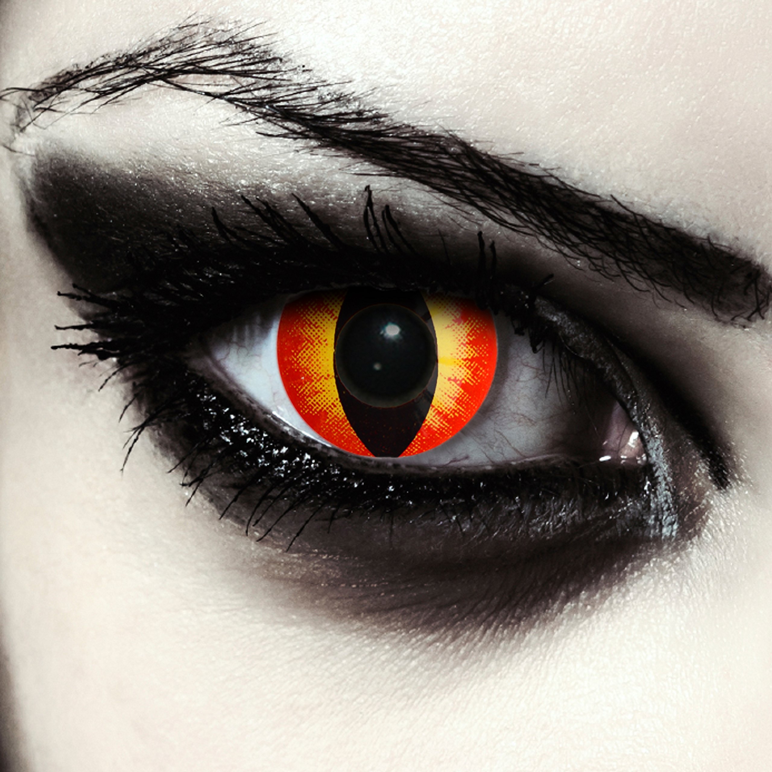 Feure red colored carnival Halloween dragon contact lenses.Diameter: 14.00mm BC: 8.60.Covers 100 .Including 1 free storage container for fiery red contact lenses (only within Germany).Fiery, colored cats eyes in red.