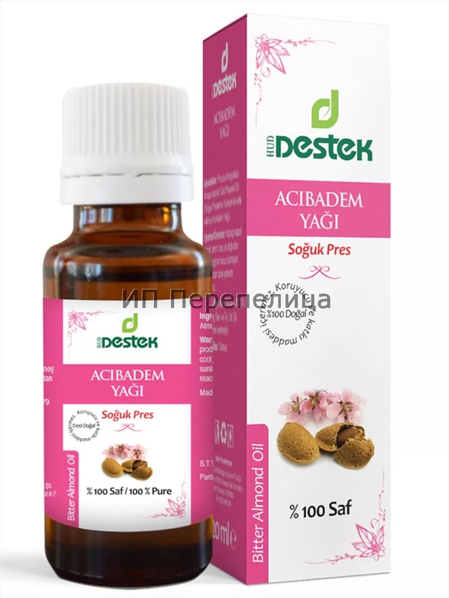 Bitter almond oil is used to create creams, lotions for the face and body, hair masks, cosmetic milks, and body wraps. It is used for massage and added to ready-made creams and shampoos. In its pure form, it can be rubbed into nails and applied to eyebrows and eyelashes. Almond oil is used on problem areas such as elbows, knees, and heels. It slows down the aging process: if you massage the skin with it, you can noticeably improve its condition, reducing sagging and fine wrinkles due to the organic acids it contains. The oil enhances tissue regeneration, promotes wound healing and reduces the appearance of scars and stretch marks, and provides protection from adverse external factors (sun radiation, frosty air, strong winds). The greatest moisturizing effect is achieved when applied to damp skin after cleansing. It cares for all skin types—dry, combination, and oily—minimizes pores and inflammation, and reduces shine.