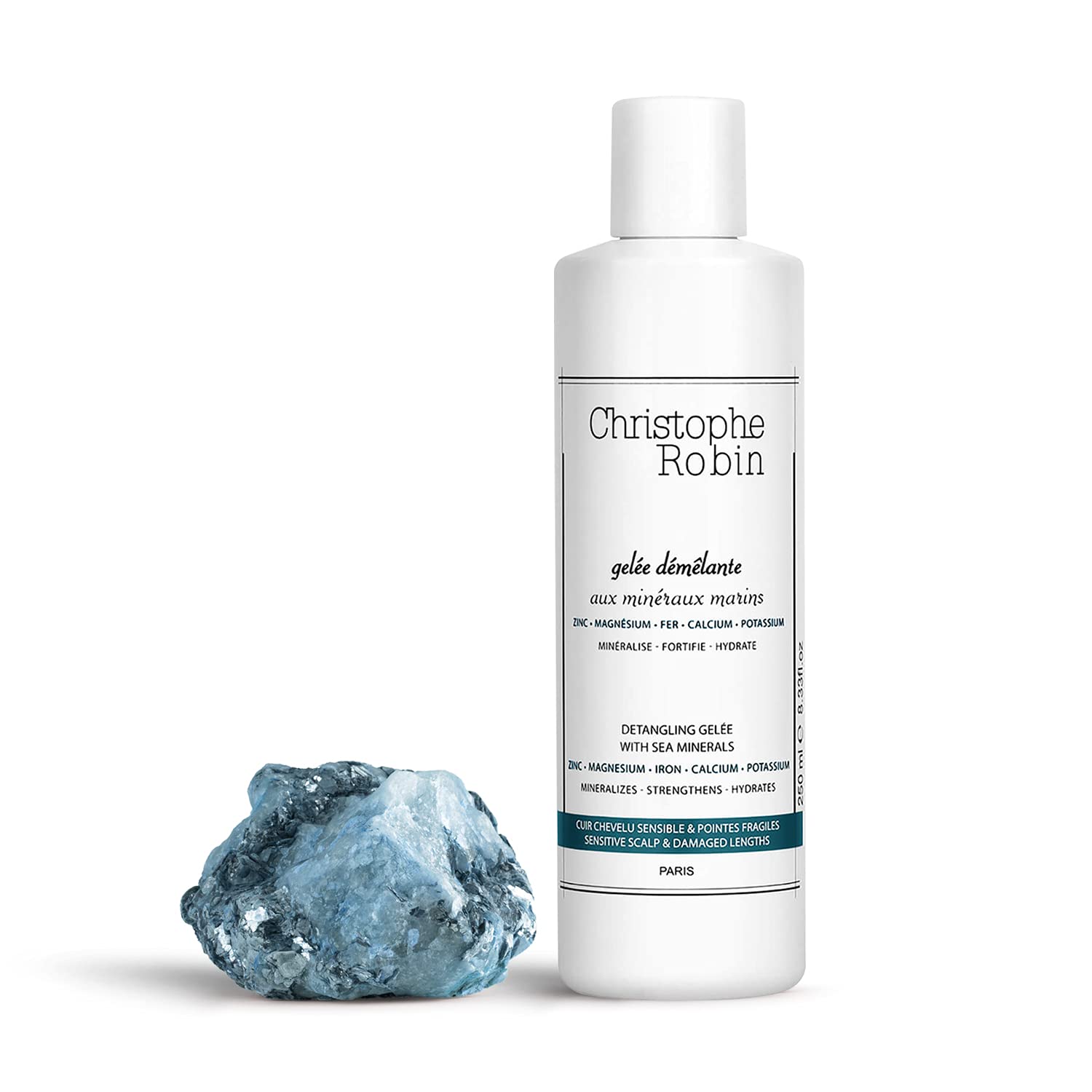 Detangling Jelly with Sea Minerals is the essential second step for a complete detox treatment. Ideal after the Purifying Scrub, this fresh jelly texture instantly detangles without weighing hair down. Sea minerals (zinc, magnesium, iron, calcium and potassium), essential for hair health, remineralize the scalp and help strengthen the hair fiber. Its formula is enriched with a 100 natural, highly emollient active ingredient to provide hydration and softness.Christophe Robin Detangling Conditioner with Sea Minerals 250 ml. La gelée démêlante avec des minéraux de mer est la deuxième étape essentielle pour un ril de désintoxication complet Idéal après le gommage purifiant, cette texture fraîche gelée démêle instantanément sans alourdir les cheveux. Minéraux de mer (zinc, magnésium, fer, calcium et potassium), essentiels à la santé des cheveux, reminéralisent le cuir chevelu et aident à fortifier la fibre capillaire. Sa formule est enrichie d'un ingrédient actif 100 naturel, hautement émollient, pour apporter hydratation et douceur.Christophe Robin Après-shampoing démêlant aux minéraux marins 250 ml.