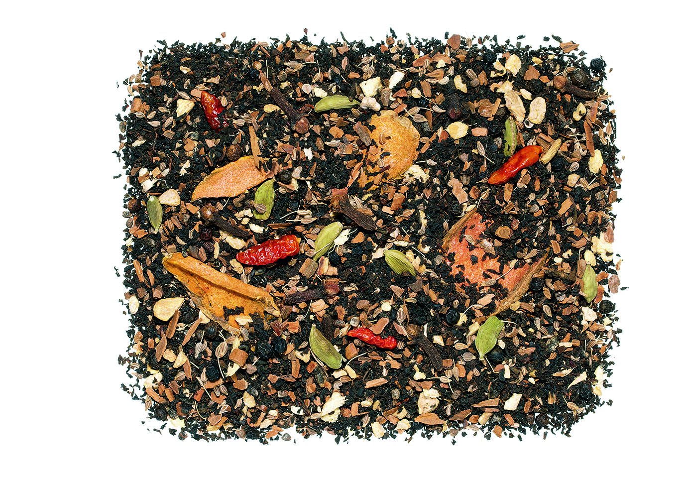 Here too we have been inspired by India and created a herbal tea mix with black tea and Ayurvedic trains, which can be seen. The luminous discs of the turmeric root provide a slightly different spicy nuance, which harmonizes with the other spices so typical of chai. Warming chili boats provide individual spiciness. Also enjoy with milk. 3-5 minutes steeping time 100 C water temperature 4-5 hardened teaspoons 1 liter INGREDIENTS black tea (36 ), cinnamon pieces, turmeric slices (10 ), ginger, animal seeds, black pepper, carnation, cardamom seeds, whole cardamom, chili shots.Kruidentheemengsel met zwarte thee, kurkuma chai, zonder toevoeging van aroma, 1 kg Ook hier hebben we ons weer door India laten inspireren en een kruidentheemix met zwarte thee en ayurvedische treinen gecreëerd, die gezien kan worden. De lichtgevende schijven van de kurkumawortel geven een iets andere kruidige nuance, die harmonieert met de andere voor chai zo typische specerijen. Verwarmende chiliboten zorgen voor een individuele scherpte. Ook graag met melk genieten. 3-5 minuten trektijd 100 C watertemperatuur 4-5 geharde theelepels 1 liter INGREDIËNTEN zwarte thee (36 ), kaneelstukken, kurkumaschijven (10 ), gember, dierlijke zaden, zwarte peper, anjer, kardemomzaad, hele kardemom, chili schoten.