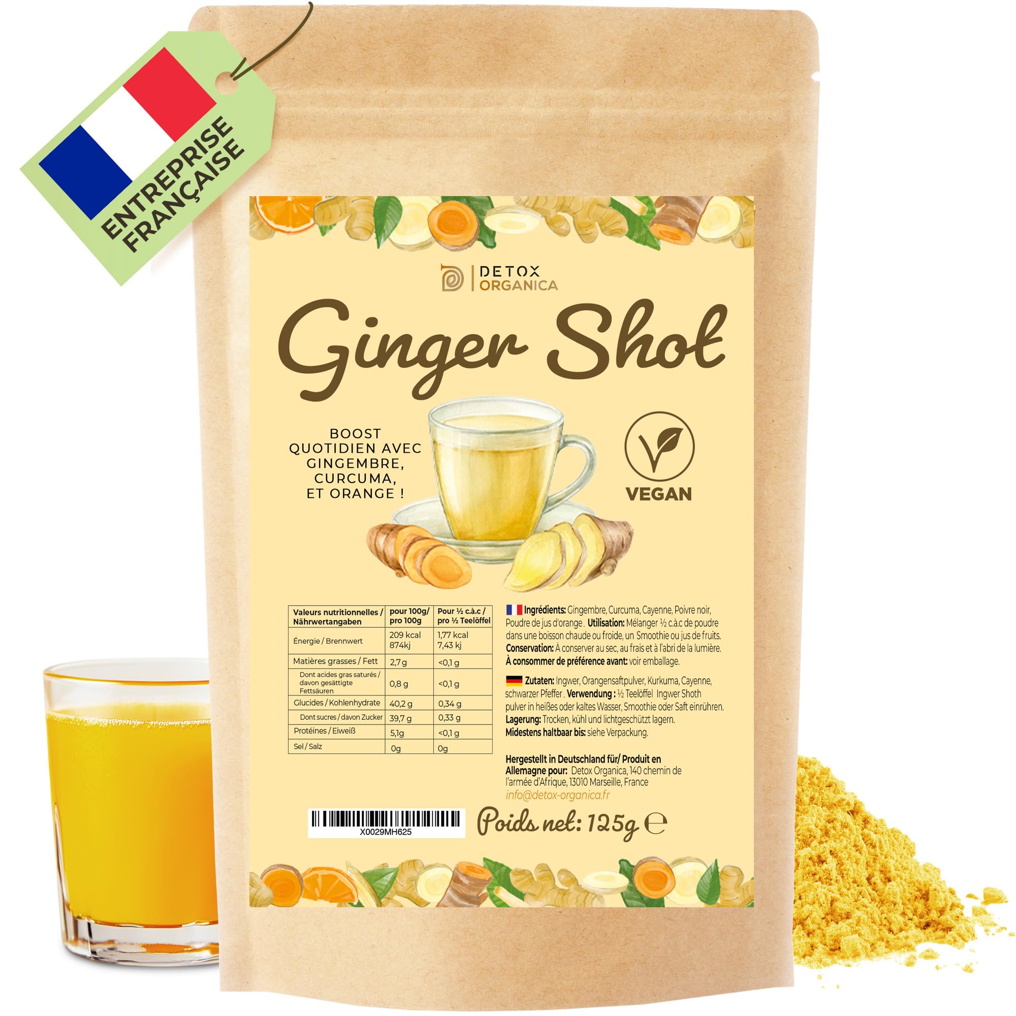 Money-back guarantee: French customer service. Try our product with complete peace of mind. If you are not satisfied, please contact us and we will refund the full purchase price. ?Online Exclusive: Available only here! Treat yourself to a concentrated burst of energy and well-being in one simple step! This deliciously fruity and spicy blend of ginger and turmeric powder will delight your palate. PLEASE NOTE: This is a 100 powdered spice blend (not an infusion) ready to use. The blend is naturally spicy due to the ginger. We recommend starting with 1 4 tsp, then gradually adjusting to your taste and desired intensity. ? Economical, Convenient, and Resealable Size: Convenient for preparing multiple energizing and detoxifying shots at home every day. Up to 160 shots are possible with this ginger juice mix. Powdered Ginger Shot Mix, Ultra Convenient and Versatile: Ready-to-use powder that's very easy to measure: just add ½ tsp to your glass of water, yogurt, tea, smoothie, or fruit juice. Enjoy it in a hot or cold beverage as you prefer! Dissolves easily. 100 Natural and Vegan Recipe: A blend of powdered ginger, powdered turmeric, orange juice powder, black pepper, and cayenne pepper for a guaranteed detoxifying and invigorating effect! A fruity and spicy mix perfect for a delicious homemade ginger shot! Boost Your Immunity and Energy Every Day! This powerful blend of ginger, turmeric, and dried orange for making ginger shots helps strengthen your immune system and give your day a boost.Garantie satisfait ou remboursé : Service client français. Testez notre produit en toute tranquillité. Si vous n'êtes pas satisfait, n'hésitez pas à nous contacter et nous vous remboursons l'intégralité du prix d'achat. ?Exclusivité en Ligne : Disponible uniquement ici ! Offrez-vous un concentré d'énergie et de bien-être en un geste simple! Ce mélande de poudre de gingembre et de curcuma, délicieusement fruité et épicé, saura ravis votre palais. ATTENTION: Il s'agit d'un mélange d'épices 100 en poudre (non infusion) prêt à l'emploi. Le mélange est naturellement épicé en raison du gingembre. Nous recommandons de commencer avec 1 4 de càc, puis d'ajuster progressivement selon votre goût et l'intensité souhaité. ? Format Économique, Pratique et Refermable : Pratique pour préparer quotidiennement de multiples shots énergisants et détox à la maison. Jusqu'à 160 shots possibles avec ce mélange pour jus de gengembre. Préparation en Poudre pour Ginger Shot, Ultra Pratique et Polyvalente : Poudreprête à l'emploi et très facile à doser : ajoutez ½ c. à c. dans votre verre d'eau, yaourt, thé, smoothie ou jus de fruits. À boire dans une boisson chaude ou froide selon vos envies ! Se dissout facilement. Recette 100 Naturelle et Vegan : Association de gingembre en poudre, curcuma en poudre, poudre de jus d'orange, poivre noir et cayenne pour un effet détox et tonique assuré! Mélange fruité et épicé parfait pour un délicieu shot de gingembre fait maison!. Boost Immunité et Énergie au Quotidien! Ce mélange puissant de gingembre, curcuma et orange séchée pour préparation de Ginger Shot aide à renforcer votre système immunitaire et à donner un coup de fouet à votre journée.DETOX ORGANICA Ginger Shot - Jusqu'à 160 shots de Jus de Gingembre et Curcuma- Booster et Detox - 125g Préparation en poudre pour pour thé, infusion et jus - Mélange pour Shot gingembre 125 g (Lot de 1)