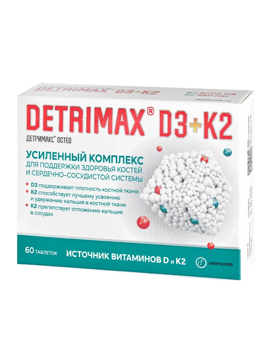 Усиленный комплекс для поддержки здоровья костей и сердечно-сосудистой системы ДЕТРИМАКС ОСТЕО содержит витамин D3 для обеспечения прочности костей и витамин K2 в форме менахинон-7 (МК-7) для лучшего усвоения и удержания кальция в костной ткани и предотвращения его отложения в сосудах и в почках.