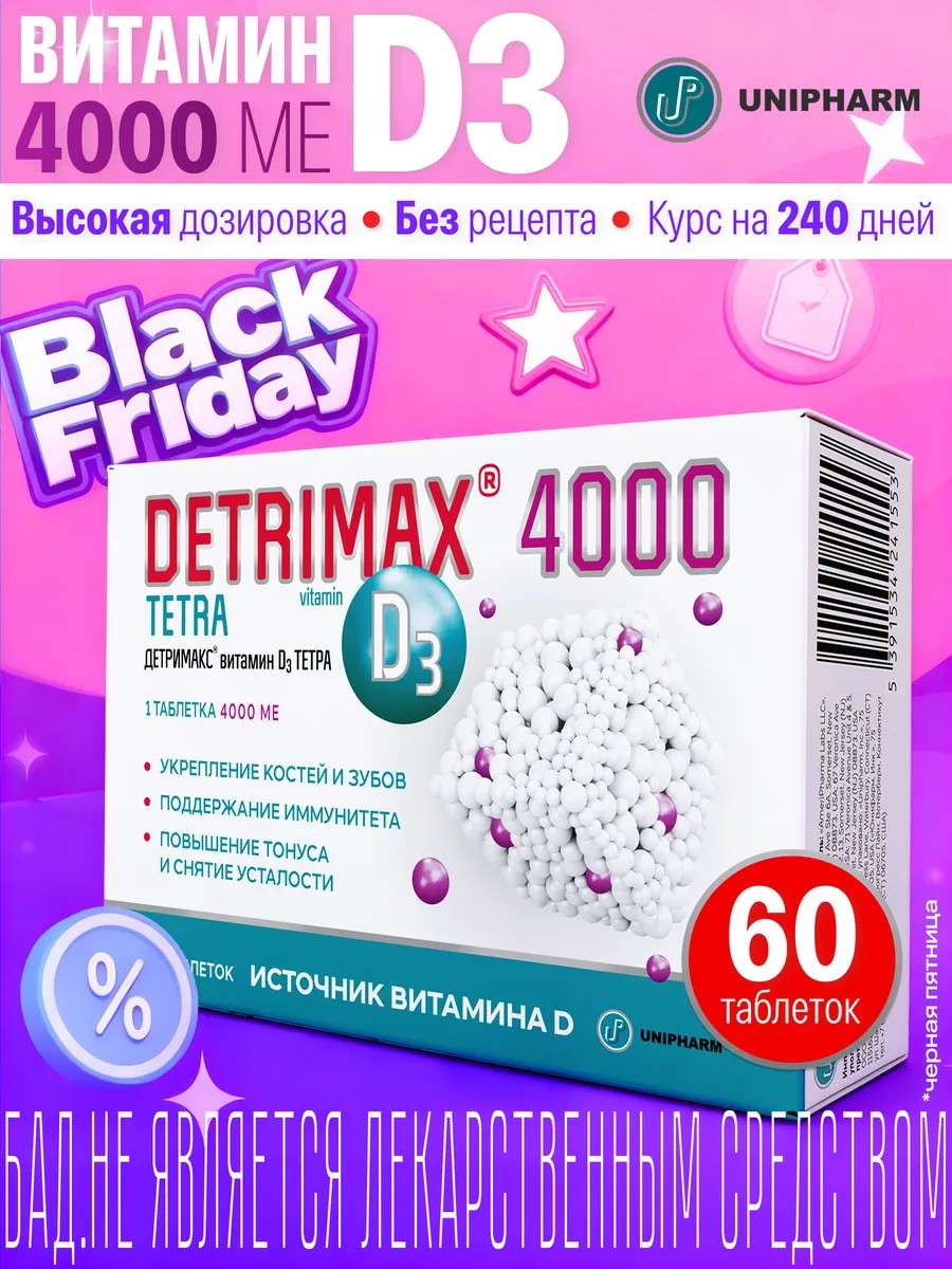 Предложение ! ДЕТРИМАКС ТЕТРА 4000 содержит витамин D3 - жизненно важный жирорастворимый витамин, необходимый для поддержания иммунитета, снижения риска простудных заболеваний, укрепления костей и зубов, снятия усталости и повышения тонуса, для поддержания силы мышц, лучшего усвоения информации, концентрации внимания и развития памяти, для поддержания репродуктивной функции. В таблетке содержится 4000 МЕ витамина D3. Состав ДЕТРИМАКС - без сахара, без подсластителей и без ароматизаторов. С ДЕТРИМАКС Витамин Д3 укреплять иммунитет просто. (За счет риски для деления таблетки на части).
