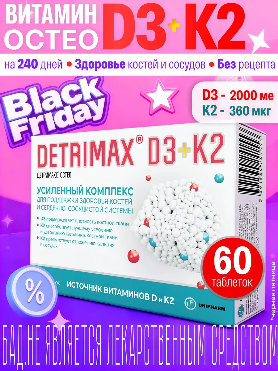 Усиленный комплекс Детримакс D3+K2 Детримакс Остео для поддержки здоровья костей и сердечно-сосудистой системы ДЕТРИМАКС ОСТЕО содержит витамин D3 для обеспечения прочности костей и витамин K2 в форме менахинон-7 (МК-7) для лучшего усвоения и удержания кальция в костной ткани и предотвращения его отложения в сосудах и в почках.ДЕТРИМАКС ОСТЕО рекомендуется в качестве биологически активной добавки к пище — дополнительного источника витамина D и витамина K2, способствует: поддержанию плотности и нормальной структуры костной ткани, лучшему усвоению и удержанию кальция в костной ткани, препятствует отложению кальция в сосудах, что способствует поддержанию здоровья сердечно-сосудистой системы.